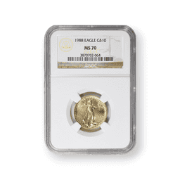 The 1988 $10 American Gold Eagle, authenticated and certified by the Numismatic Guaranty Corporation (NGC), is a quarter-ounce gold coin minted from 22-karat gold with a purity of .9167. It features the iconic Saint-Gaudens design of Lady Liberty with a torch and olive branch on the obverse, and Miley Busiek's family of eagles on the reverse, emblematic of American family values and traditions. This NGC certification guarantees the coin's condition and authenticity, and with a mintage of 49,000, it is a cherished piece for collectors and a solid investment for those interested in gold.