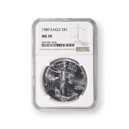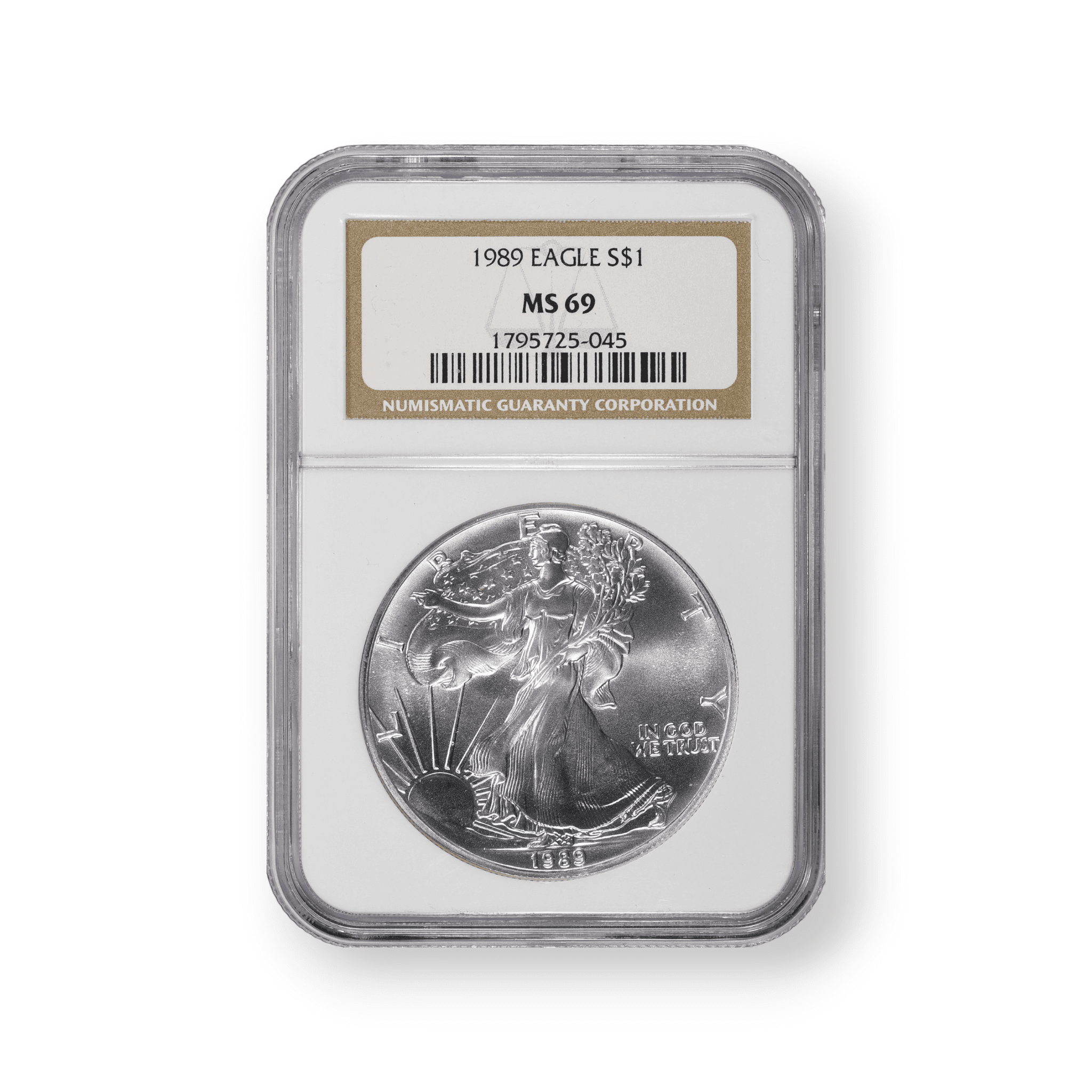 The 1989 $1 American Silver Eagle holds its prestige as an NGC-certified coin, striking a balance between collectibility and bullion investment. Minted from one ounce of .999 fine silver, it showcases the revered Walking Liberty design by Adolph A. Weinman on the obverse, a symbol of boundless freedom and optimism. The reverse design, by John Mercanti, features a robust heraldic eagle, emblematic of America's strength and democratic spirit. This coin, with a mintage of 5,203,327, is authenticated and graded by the NGC, ensuring it meets strict standards for condition and authenticity, making it a valuable and trusted addition to any collection.