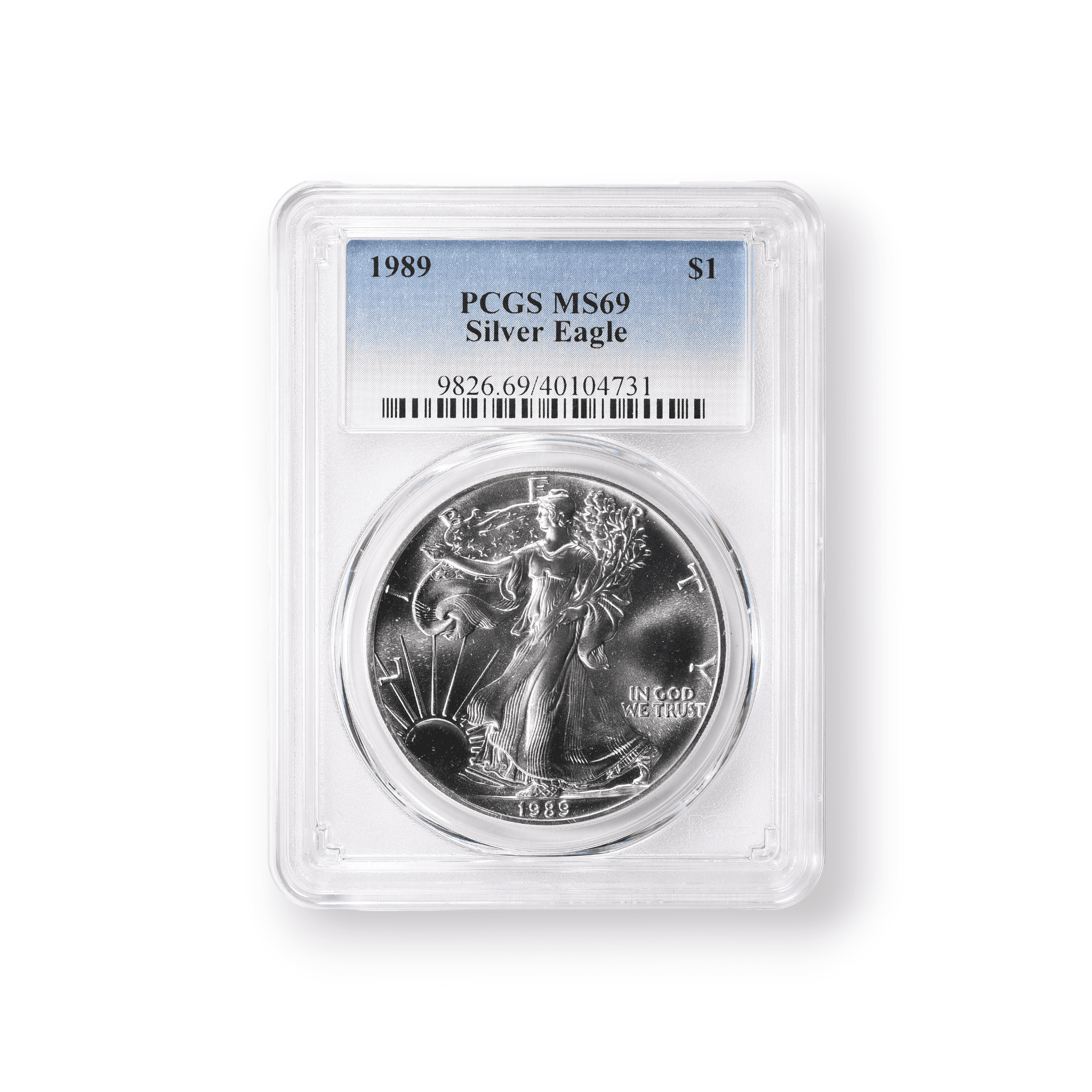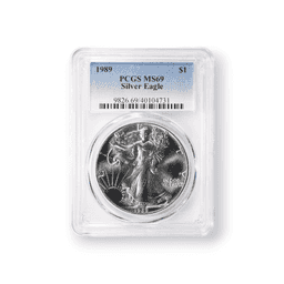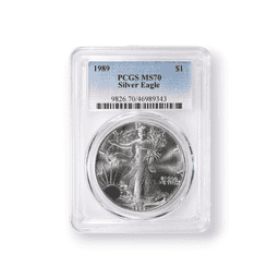 The 1989 $1 American Silver Eagle, with certification from the Professional Coin Grading Service (PCGS), is a prized asset for collectors and investors. This particular coin, minted in one ounce of .999 pure silver, features the historic Walking Liberty design by Adolph A. Weinman on the obverse, exuding the ideals of freedom and courage. The reverse is adorned with John Mercanti's interpretation of the heraldic eagle, representing the nation's grandeur and resolve. With a total mintage of 5,203,327, the PCGS certification of this coin guarantees its authenticity and mint condition, securing its desirability and collectible status in the world of numismatics.