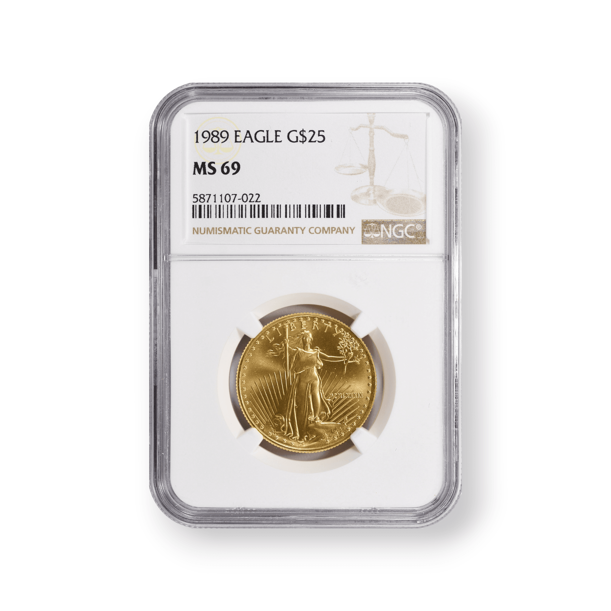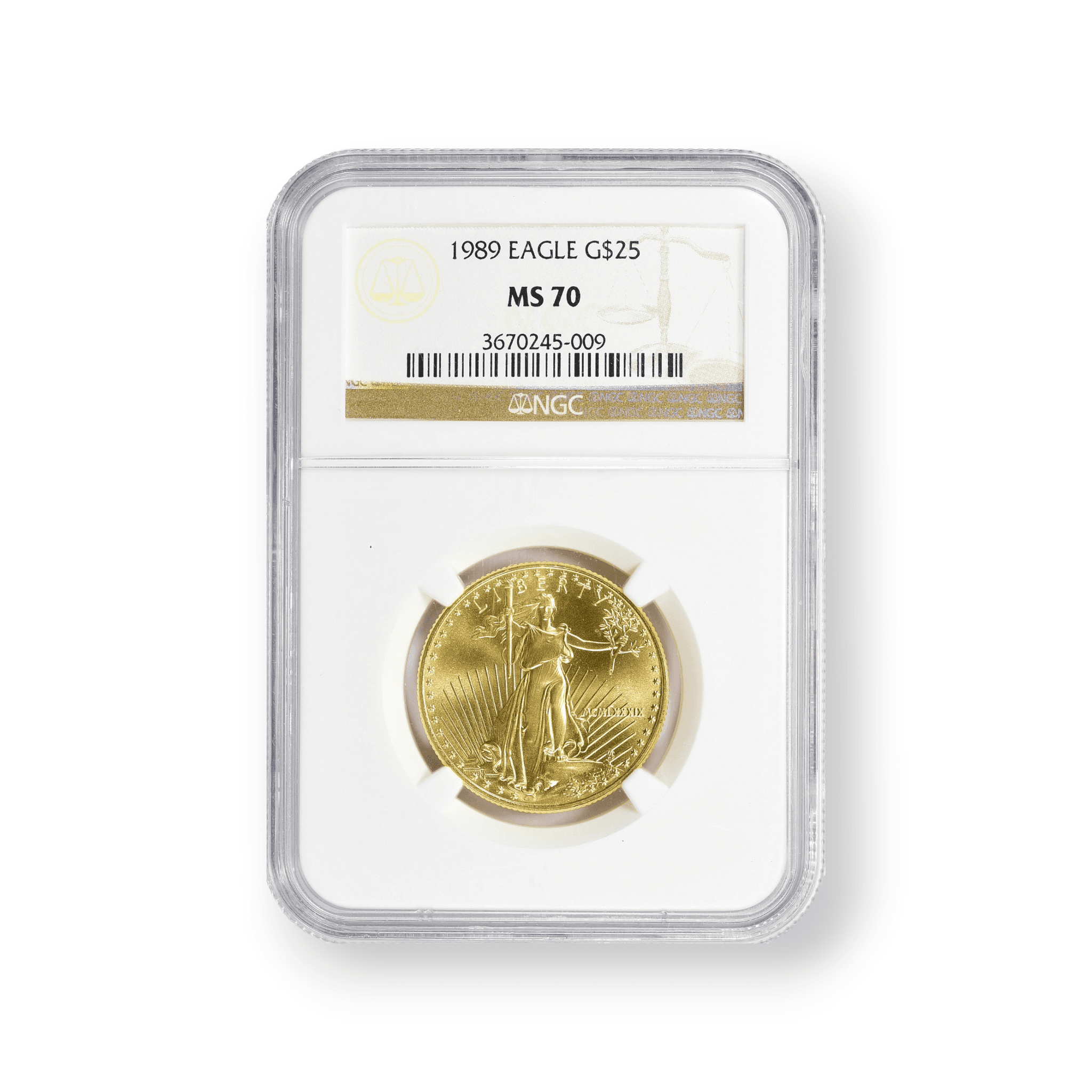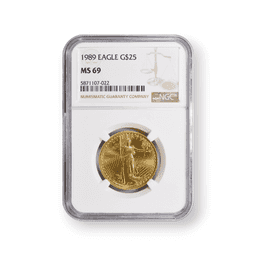 The 1989 $10 American Gold Eagle, certified by the Numismatic Guaranty Corporation (NGC), is a quarter-ounce gold coin struck from 22-karat gold, blending collectibility with bullion investment. The coin features the classic Saint-Gaudens design of Lady Liberty on the obverse, and the Miley Busiek design depicting a family of eagles on the reverse. The NGC certification ensures the coin's authenticity and condition, and with a mintage of 81,789, this coin is a sought-after item for collectors and investors looking for assets that combine numismatic appeal with the intrinsic value of gold.