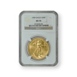 The 1989 1 oz American Gold Eagle, inscribed with the Roman numeral MCMLXXXIX, is a significant offering from the United States Mint's American Gold Eagle series. Composed of .9167 fine gold (22 karat), this coin is adorned with Augustus Saint-Gaudens' illustrious design of Lady Liberty on the obverse, and Miley Busiek's depiction of a family of eagles on the reverse, capturing the essence of American freedom and family values. Having undergone NGC (Numismatic Guaranty Corporation) certification, this coin is verified for its authenticity and condition, enhancing its appeal to collectors and investors alike. The 1989 edition, being part of the early years of the series, holds particular interest for those looking to enrich their collection with a piece of numismatic history, guaranteed for its quality and investment worth.