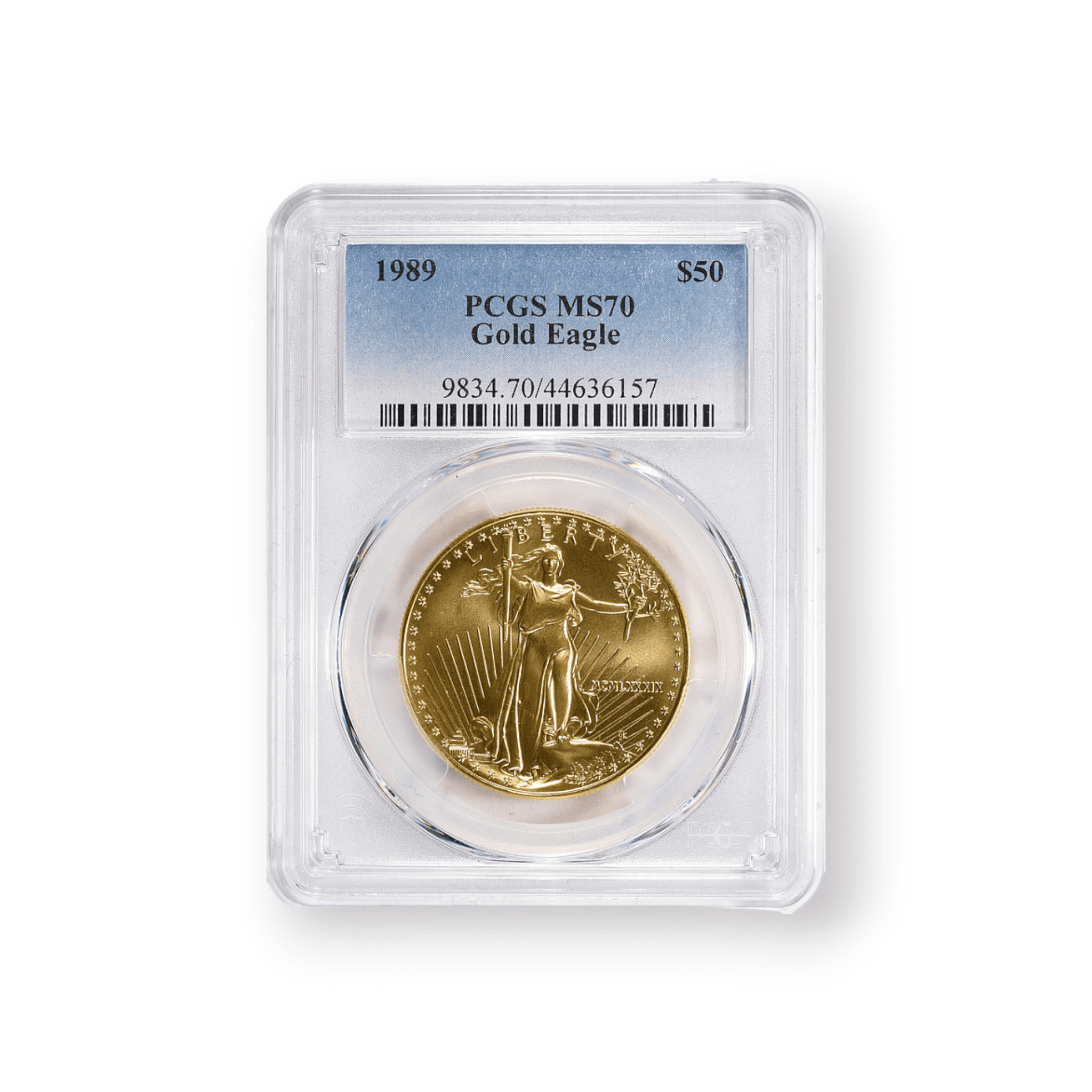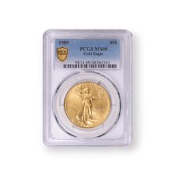 The 1989 (MCMLXXXIX) 1 oz American Gold Eagle, PCGS Certified, is a distinguished piece in the acclaimed American Gold Eagle series from the United States Mint. Struck from .9167 fine gold (22 karat), this coin carries the esteemed obverse design by Augustus Saint-Gaudens, featuring Lady Liberty with a torch in one hand and an olive branch in the other, set against the Capitol building. The reverse, designed by Miley Busiek, depicts a male eagle in flight carrying an olive branch to a nest with a female eagle and their hatchlings, embodying the American ideals of freedom and family. The certification by PCGS (Professional Coin Grading Service) attests to the coin's authenticity and condition, making it highly sought after by collectors and investors for its numismatic value, gold content, and the quality assurance provided by one of the most reputable coin grading services. The 1989 Gold Eagle holds a special place among enthusiasts for its beauty, historical significance as part of America's premier gold bullion series, and the enhanced credibility and collectibility afforded by PCGS certification.