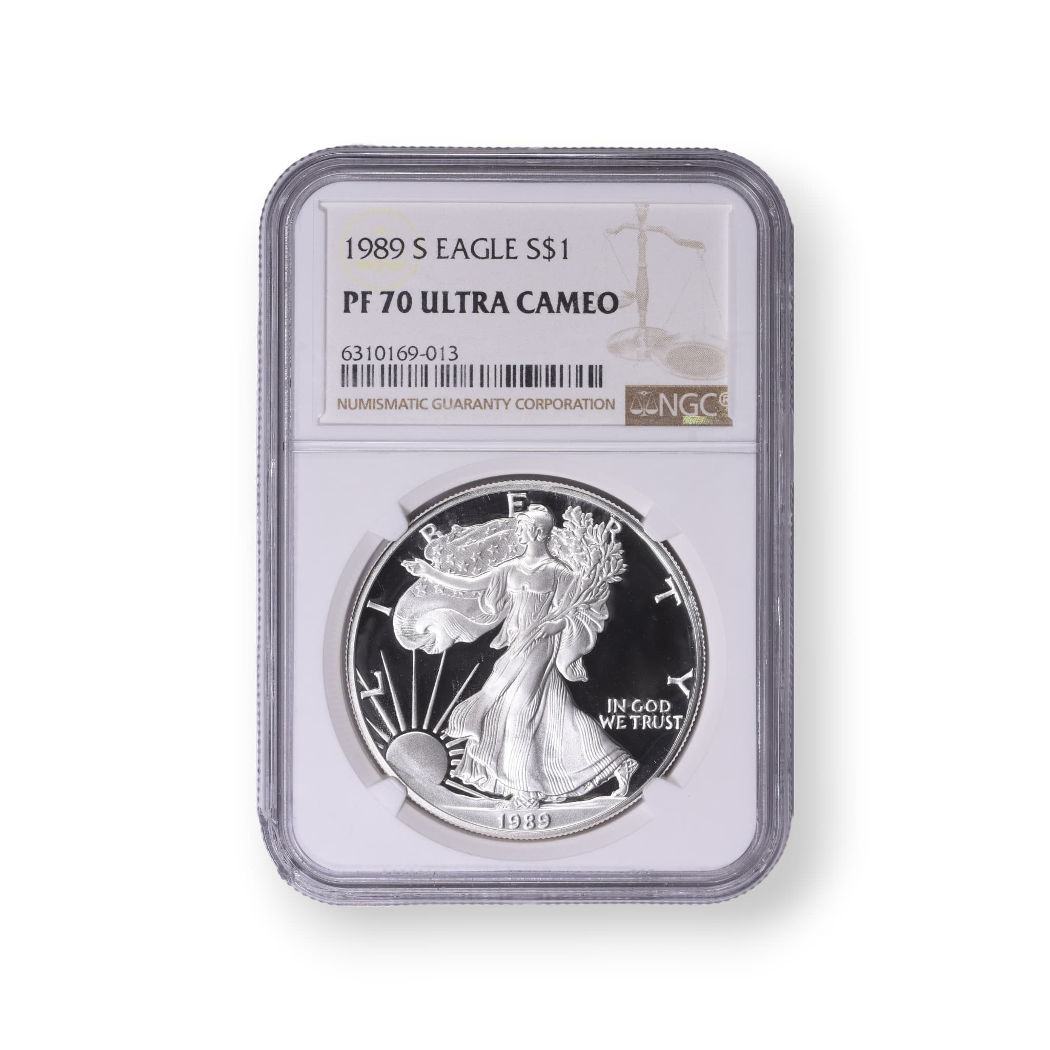 The 1989-S Proof American Silver Eagle $1 Coin is a highly sought-after numismatic item. Struck by the United States Mint in San Francisco, this coin is composed of .999 fine silver and has a weight of 31.101 grams. With a mintage of 1,654,598 pieces, this coin is graded and certified by the Numismatic Guaranty Corporation (NGC), ensuring its authenticity and condition. The obverse features the iconic Walking Liberty design by Adolph A. Weinman, while the reverse showcases the heraldic eagle design by John Mercanti. This coin is a must-have for collectors and investors alike, offering both historical significance and precious metal value.