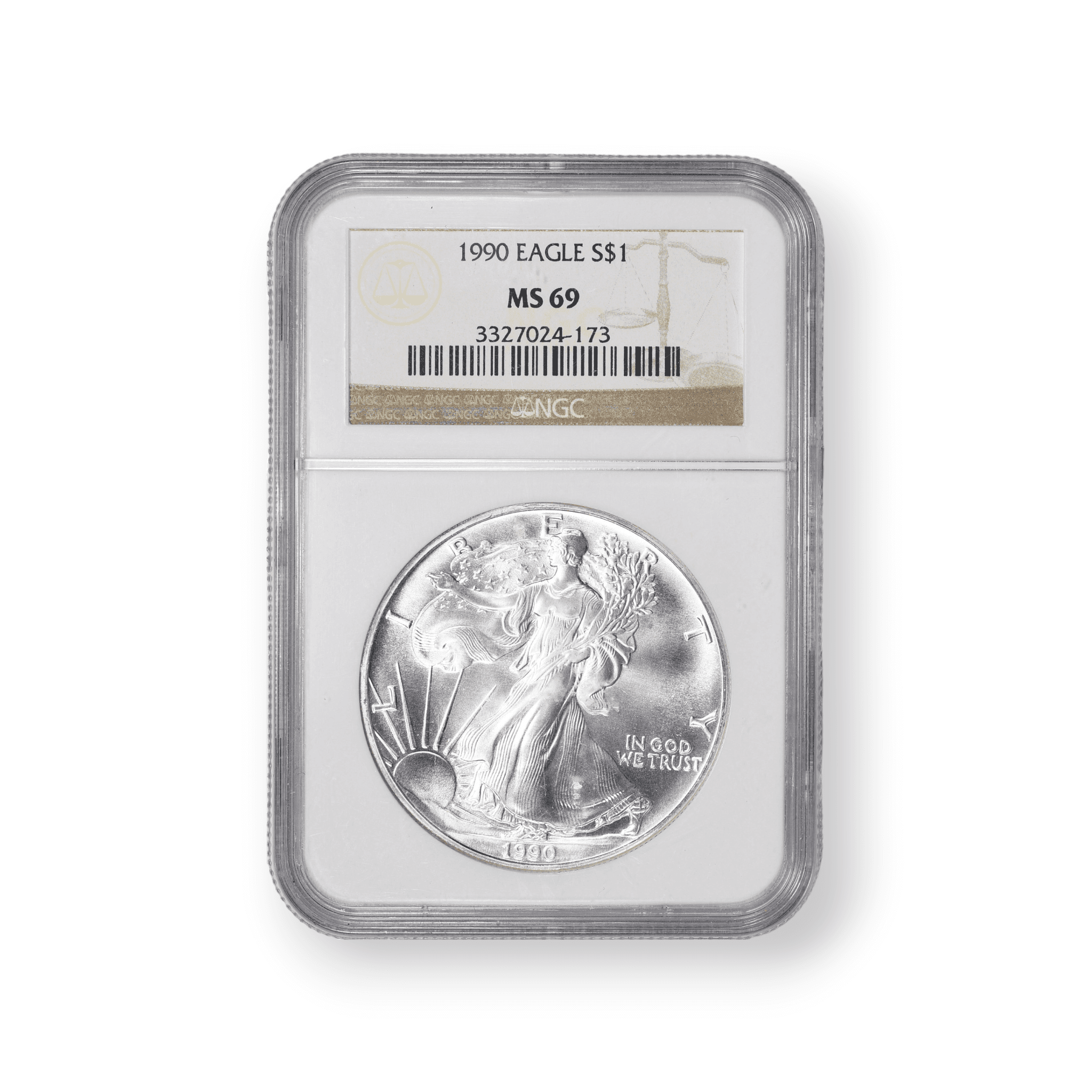 The 1990 $1 American Silver Eagle, authenticated and certified by the Numismatic Guaranty Corporation (NGC), represents a blend of numismatic artistry and investment appeal. Struck from one ounce of .999 fine silver, it features the iconic Walking Liberty design by Adolph A. Weinman on its obverse, a symbol of freedom and hope. The reverse bears the image of a heraldic eagle with a shield, masterfully designed by John Mercanti, signifying the nation's strength and unity. With a mintage of 5,840,110, this coin's NGC certification guarantees its quality and authenticity, making it a coveted piece for collectors and investors alike who value the assurance of a reputable grading service.