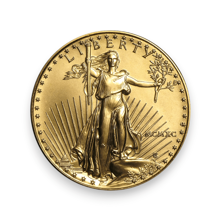 The 1990 1 oz American Gold Eagle Coin, denoted by the Roman numeral "MCMXC" for the year 1990, is a significant part of the American Gold Eagle series, minted by the United States Mint. This coin is composed of one ounce of gold with a purity of 22 karats, equivalent to .9167 fineness. It showcases the iconic Saint-Gaudens design on the obverse, featuring Lady Liberty with a torch and olive branch, symbols of freedom and hope. The reverse, designed by Miley Busiek, displays a family of eagles, an emblem of American unity and familial strength. In 1990, the mintage for the 1 oz American Gold Eagle was approximately 373,210 coins. This production number makes the 1990 Gold Eagle a popular choice among collectors and investors for its fine gold content, historical significance, and artistic merit within the esteemed American Gold Eagle series.