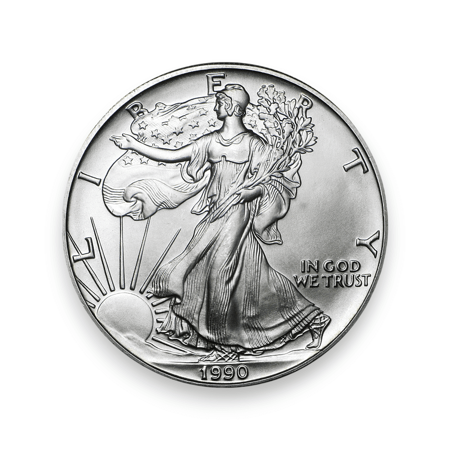 The 1990 1 oz American Silver Eagle Coin, part of the renowned American Silver Eagle series from the United States Mint, is a highly sought-after bullion coin. It is composed of one ounce of .999 fine silver, representing the series' commitment to high purity standards. The coin's obverse features the iconic "Walking Liberty" design by Adolph A. Weinman, a symbol of freedom and elegance that has been a favorite in American coinage. The reverse, designed by John Mercanti, displays a heraldic eagle behind a shield, embodying American strength and integrity. In 1990, the mintage for the American Silver Eagle was approximately 5,840,110 coins. This mintage makes the 1990 edition a well-circulated and popular choice among collectors and investors, who value it for its silver content and its role in the American Silver Eagle series.