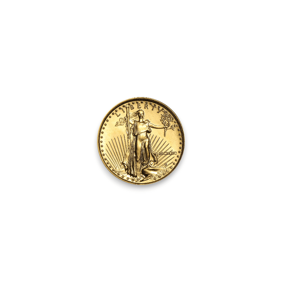 The 1990 1/10 oz American Gold Eagle Coin, part of the distinguished American Gold Eagle series, is minted by the United States Mint from 1/10th of an ounce of gold, with a purity of 22 karats or .9167 fine. This coin features the classic Saint-Gaudens design on the obverse, showcasing Lady Liberty with a torch and olive branch, embodying freedom and peace. The reverse, designed by Miley Busiek, depicts a family of eagles, symbolizing American unity and strength. The mintage for the 1990 1/10 oz American Gold Eagle was approximately 210,210 coins. This production volume makes the 1990 edition a sought-after year for collectors and investors, prized for its blend of gold content, artistic design, and its place within the prestigious American Gold Eagle series.