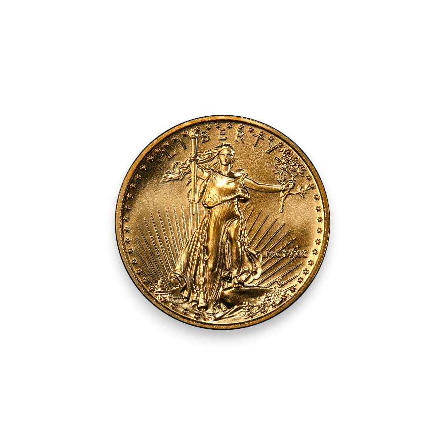 The 1990 1/4 oz American Gold Eagle Coin, marked with the Roman numeral "MCMXC" for the year 1990, is a distinguished piece in the American Gold Eagle series, produced by the United States Mint. This coin is minted from 1/4th of an ounce of gold, maintaining a purity of 22 karats, equivalent to .9167 fineness. It features the iconic Saint-Gaudens obverse design, depicting Lady Liberty with a torch and olive branch, a symbol of freedom and peace. The reverse, designed by Miley Busiek, portrays a family of eagles, representing American unity and strength. In 1990, the mintage for the 1/4 oz American Gold Eagle was approximately 62,401 coins. This production number makes the 1990 Gold Eagle a sought-after item for collectors and investors, prized for its combination of fine gold content, artistic design, and its place within the prestigious American Gold Eagle series.