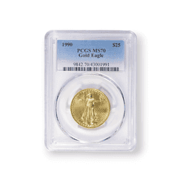The 1990 $25 American Gold Eagle, certified by the Professional Coin Grading Service (PCGS), is a half-ounce gold coin composed of 22-karat gold, adhering to a fineness of .9167. This coin is adorned with the Saint-Gaudens' Lady Liberty obverse design and the Miley Busiek reverse design that captures an American eagle family. The PCGS certification confirms the coin’s mint condition and authenticity. With a mintage of 62,401, it is a sought-after collector's item and a valued investment for those interested in gold's enduring worth.