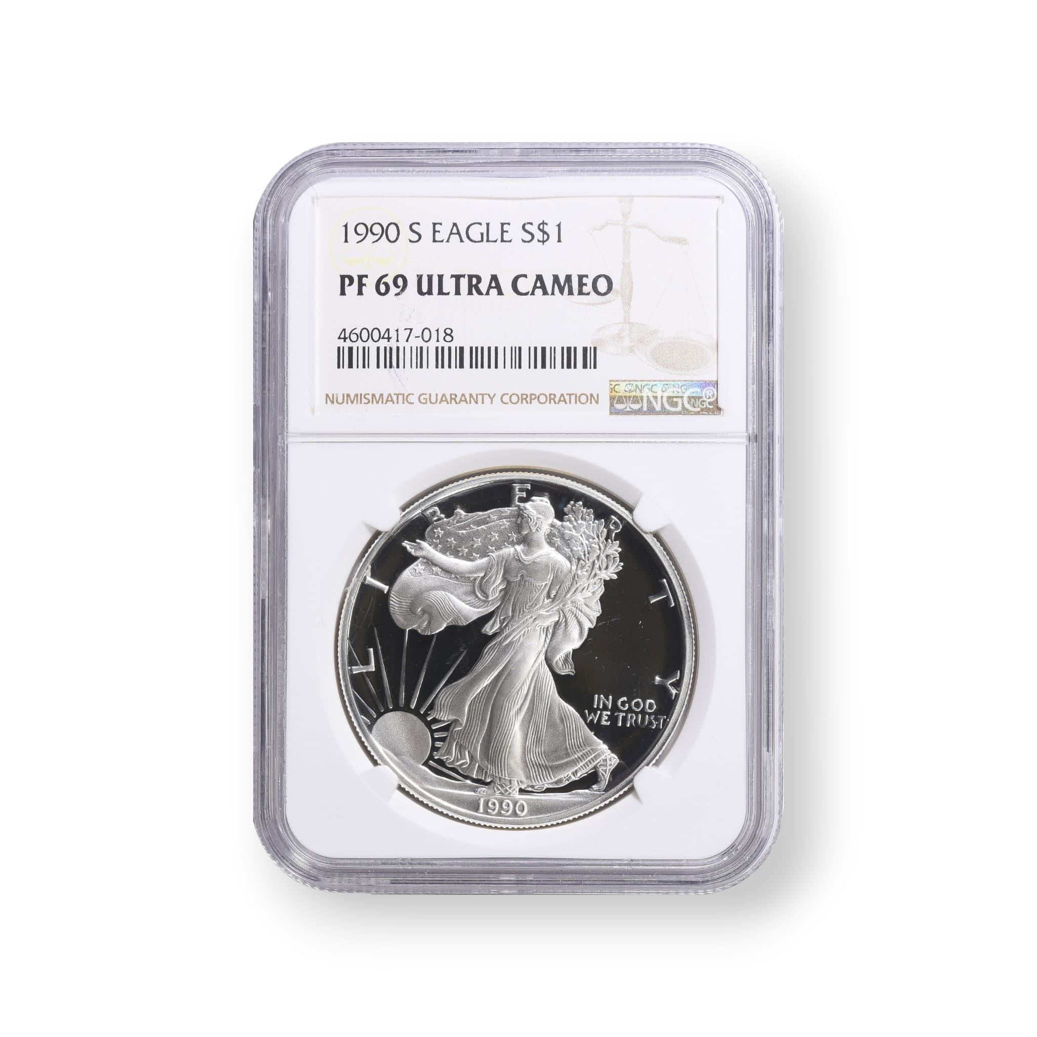 The 1990-S Proof American Silver Eagle $1 Coin is a highly sought-after numismatic item. Struck by the United States Mint in San Francisco, this coin is composed of .999 fine silver and weighs 31.101 grams. With a diameter of 40.6 mm and a reeded edge, the obverse features the iconic Walking Liberty design by Adolph A. Weinman, while the reverse showcases the heraldic eagle with shield design by John Mercanti. This particular coin has been certified by the Numismatic Guaranty Corporation (NGC) and comes encapsulated, ensuring its authenticity and condition. The mintage for the 1990-S Proof American Silver Eagle is 1,063,648 coins, making it a valuable addition to any collection.