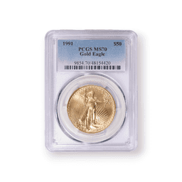 The 1991 (MCMXCI) 1 oz American Gold Eagle, certified by the Professional Coin Grading Service (PCGS), is a notable collector's piece from the esteemed American Gold Eagle series minted by the United States Mint. This coin, composed of .9167 fine gold (22 karat), showcases the iconic design by Augustus Saint-Gaudens on the obverse, featuring Lady Liberty with a torch and olive branch, set against a backdrop of the Capitol. The reverse, created by Miley Busiek, depicts a male eagle carrying an olive branch to a nest with a female eagle and eaglets, embodying the American spirit of family and freedom. The PCGS certification confirms the coin's authenticity and assesses its condition, enhancing its appeal to collectors and investors who value the combination of artistic merit, historical significance, and verified quality. As part of the American Gold Eagle series, the 1991 edition, with its PCGS certification, is especially valued for its investment potential and as a cherished piece of American numismatic art.