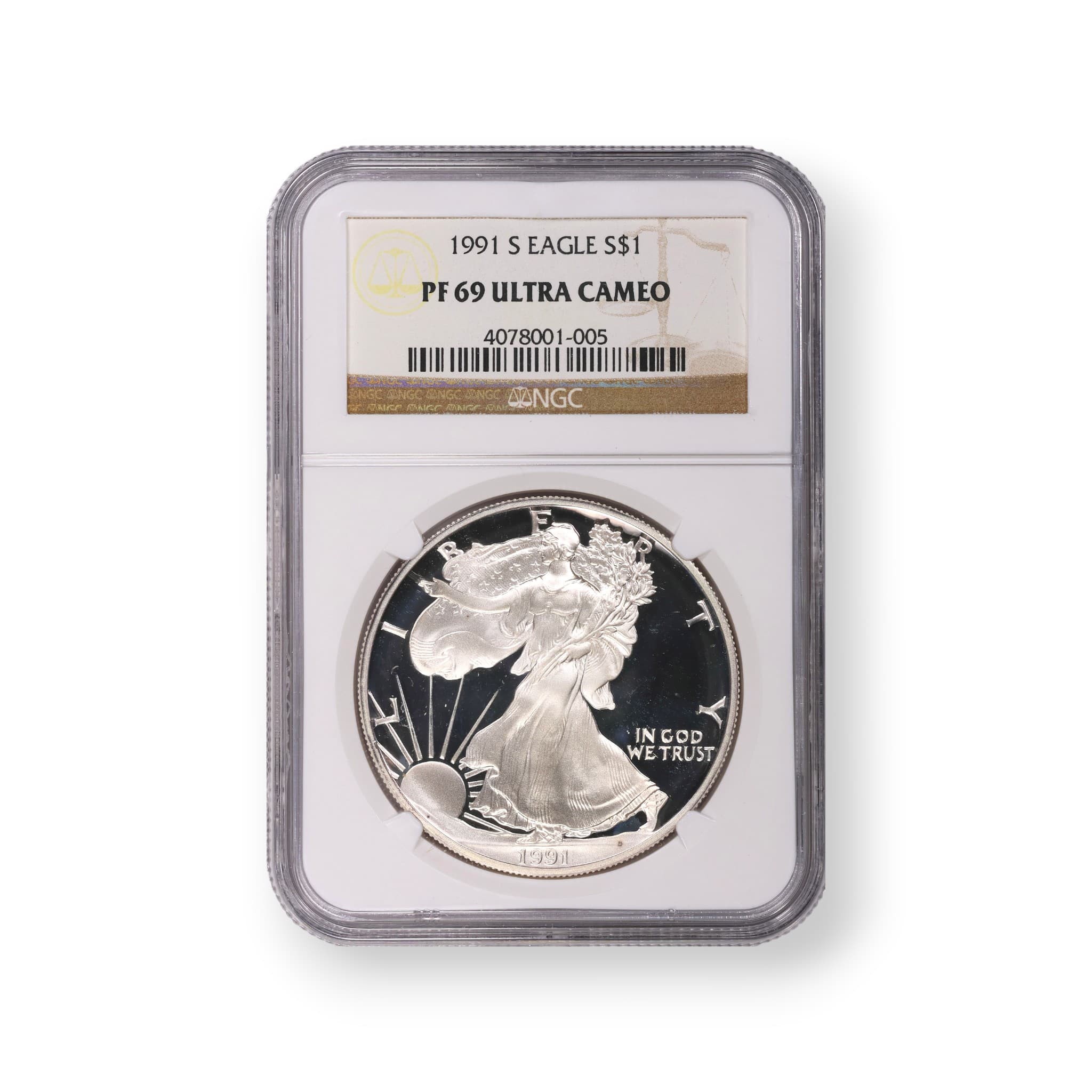 The 1991-S Proof American Silver Eagle $1 Coin is a highly sought-after numismatic item. Struck by the United States Mint in San Francisco, this coin is composed of .999 fine silver and weighs 31.101 grams. With a diameter of 40.6 mm and a reeded edge, it features the iconic Walking Liberty design by Adolph A. Weinman on the obverse and the heraldic eagle design by John Mercanti on the reverse. This particular coin has been certified by the Numismatic Guaranty Corporation (NGC) and comes encapsulated in their protective holder. The mintage for the 1991-S Proof American Silver Eagle is 1,057,357 coins, making it a valuable addition to any collection.