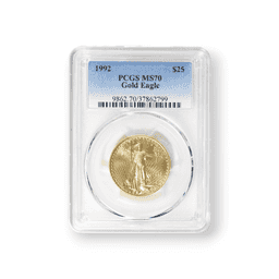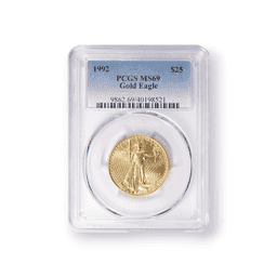 The 1992 $25 American Gold Eagle, with PCGS certification, is a half-ounce gold coin minted from 22-karat gold, denoting a .9167 fineness. It features the celebrated Saint-Gaudens obverse design of Lady Liberty and the reverse design by Miley Busiek, displaying a family of eagles. The PCGS certification confirms the coin's authenticity and mint state condition. With a mintage of 54,404, this gold eagle is a prestigious piece for collectors and offers a secure gold investment due to its trusted certification and precious metal content.