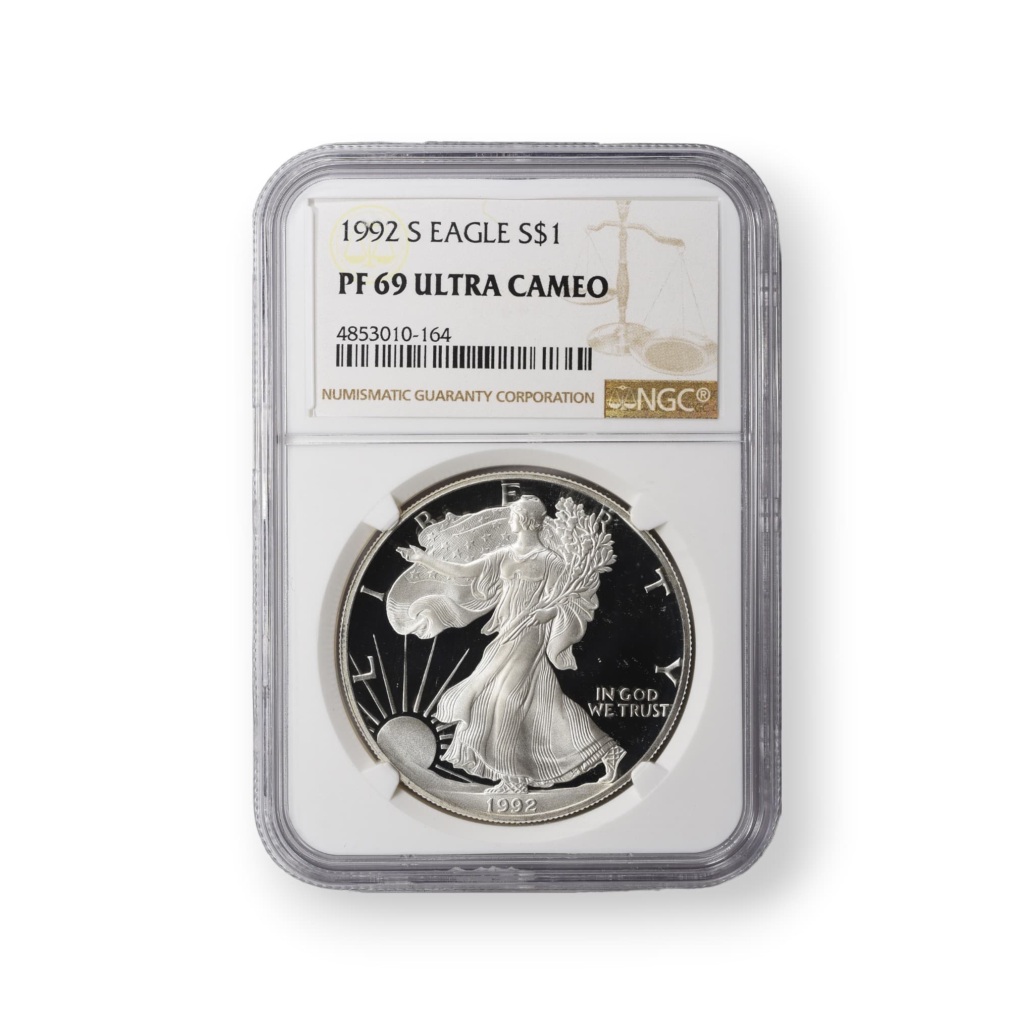 The 1992-S Proof American Silver Eagle $1 Coin is a highly sought-after numismatic item. Struck by the United States Mint in San Francisco, this coin is composed of .999 fine silver and weighs 31.101 grams. With a diameter of 40.6 mm and a reeded edge, the obverse features the iconic Walking Liberty design by Adolph A. Weinman, while the reverse showcases the heraldic eagle with shield design by John Mercanti. This particular coin has been certified by the Numismatic Guaranty Corporation (NGC) and comes encapsulated, ensuring its authenticity and condition. The mintage for the 1992-S Proof American Silver Eagle is 1,454,324 coins, making it a valuable addition to any collection.