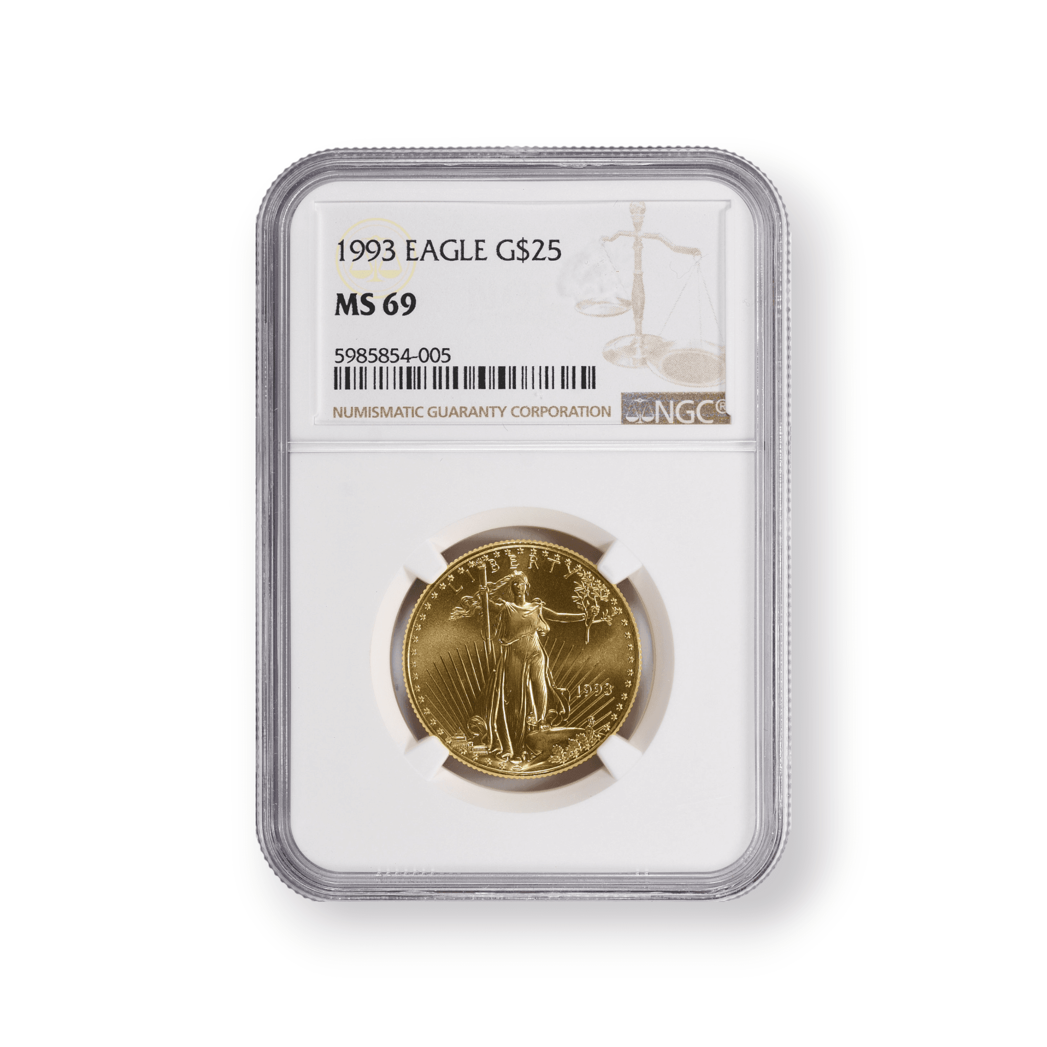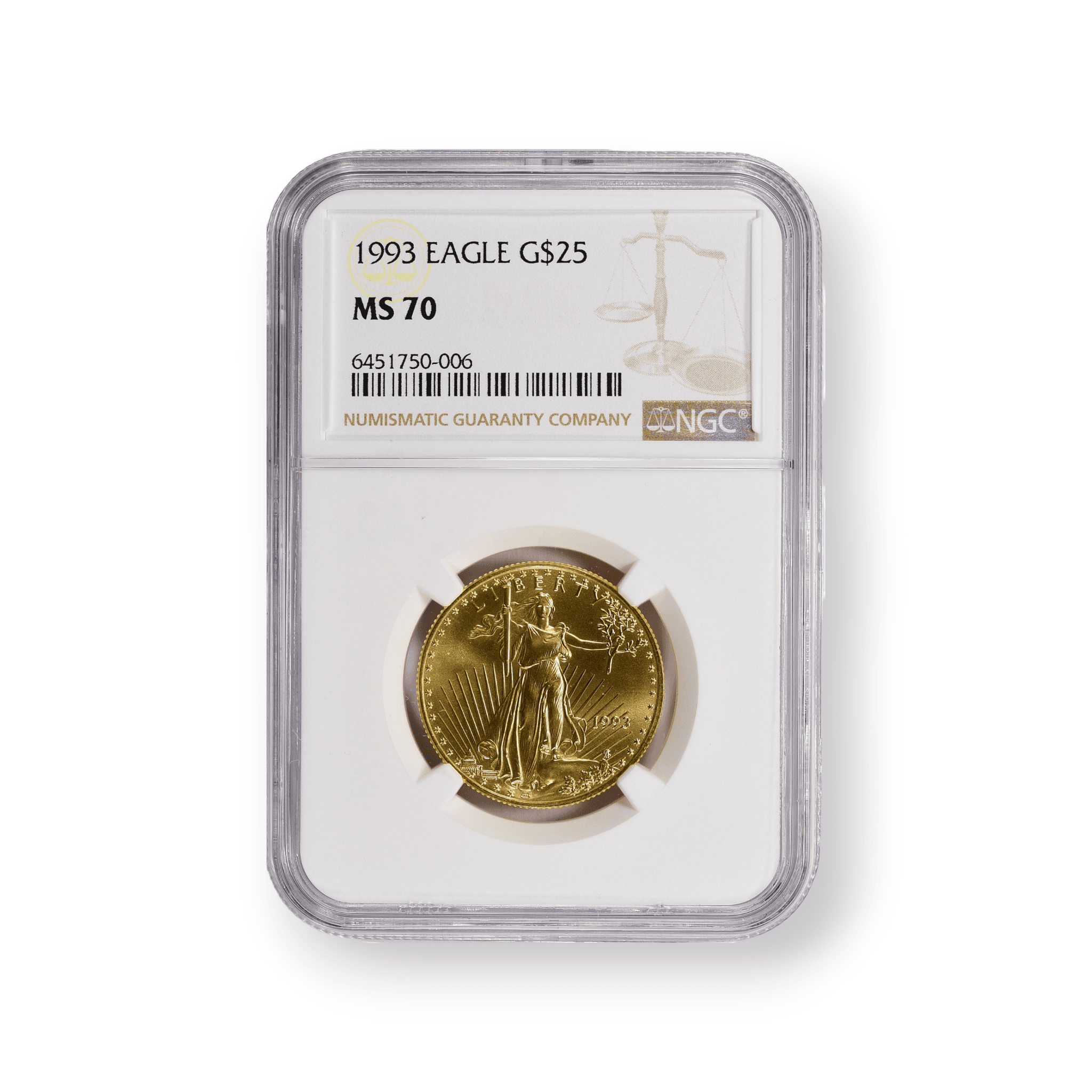 The 1993 $25 American Gold Eagle, certified by the Numismatic Guaranty Corporation (NGC), is a half-ounce gold coin minted from 22-karat gold with a .9167 fineness. It displays the Saint-Gaudens' Lady Liberty design on the obverse and Miley Busiek's family of eagles on the reverse. With a mintage of 73,324, the NGC certification assures the coin's condition and authenticity, making it a prized collectible and a prudent investment. The allure of this coin is enhanced by its NGC certification, which is highly respected among numismatists for its strict grading standards, adding an extra layer of credibility to this piece of American numismatic heritage.
