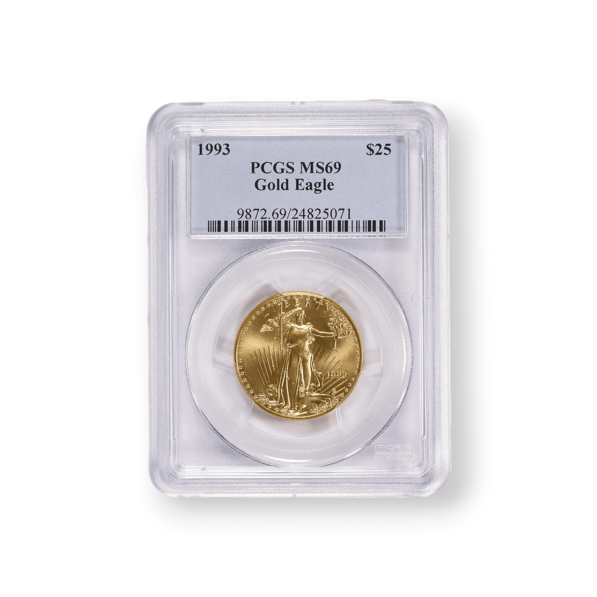 The 1993 $25 American Gold Eagle coin, certified by the Professional Coin Grading Service (PCGS), is a half-ounce piece minted from 22-karat gold, which is .9167 fine. It features the iconic Saint-Gaudens design of Lady Liberty on the obverse, and the Miley Busiek design of a family of eagles on the reverse. With a mintage of 73,324, the PCGS certification ensures the coin’s authenticity and condition, making it a valuable addition for both collectors and investors looking to add a piece of American heritage and the security of gold to their holdings.
