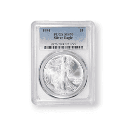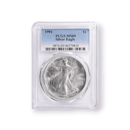 The 1994 $1 American Silver Eagle is a treasured piece for collectors and silver enthusiasts, holding the PCGS certification of authenticity and condition. Struck in one ounce of .999 fine silver by the U.S. Mint, it features the emblematic Walking Liberty design by Adolph A. Weinman on the obverse, a symbol of the nation’s enduring freedom. The reverse side showcases John Mercanti's representation of the heraldic eagle, a sign of American strength and pride. This coin has a mintage of 4,227,319 pieces, making it a relatively rarer find in the Silver Eagle series. The PCGS certification confirms the coin's quality, greatly enhancing its collectibility and appeal as a secure investment.
