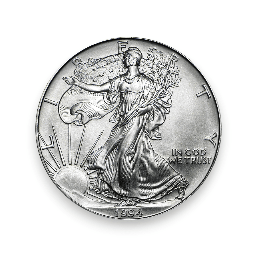 The 1994 1 oz American Silver Eagle Coin, part of the prestigious American Silver Eagle series issued by the United States Mint, is crafted from one ounce of .999 fine silver, signifying its high purity. This coin features the well-known "Walking Liberty" design by Adolph A. Weinman on the obverse, a symbol of freedom and elegance that has been a staple in American coinage. The reverse, designed by John Mercanti, displays a heraldic eagle with a shield, an emblem of American strength and unity. The 1994 American Silver Eagle is particularly notable for its mintage, which was approximately 4,227,319 coins. This production number makes the 1994 Silver Eagle a sought-after year for collectors and investors, appreciated for its fine silver content and as a significant piece in the American Silver Eagle series.