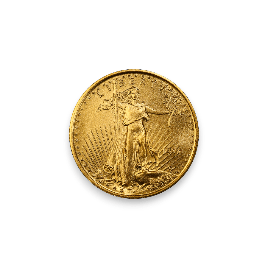 The 1994 1/4 oz American Gold Eagle Coin, a part of the distinguished American Gold Eagle series, is minted by the United States Mint. This coin contains 1/4th of an ounce of gold and is crafted with a purity of 22 karats, equivalent to .9167 fineness. It features the revered Saint-Gaudens obverse design of Lady Liberty holding a torch and olive branch, symbols of freedom and peace. The reverse, designed by Miley Busiek, depicts a family of eagles, representing the strength and unity of the United States. In 1994, the mintage for the 1/4 oz American Gold Eagle was approximately 72,650 coins. This mintage makes the 1994 edition a notable choice for collectors and investors, sought after for its blend of gold content, historical significance, and the artistic design characteristic of the American Gold Eagle series.
