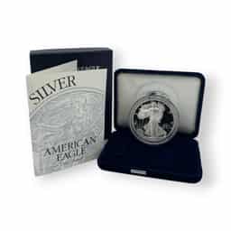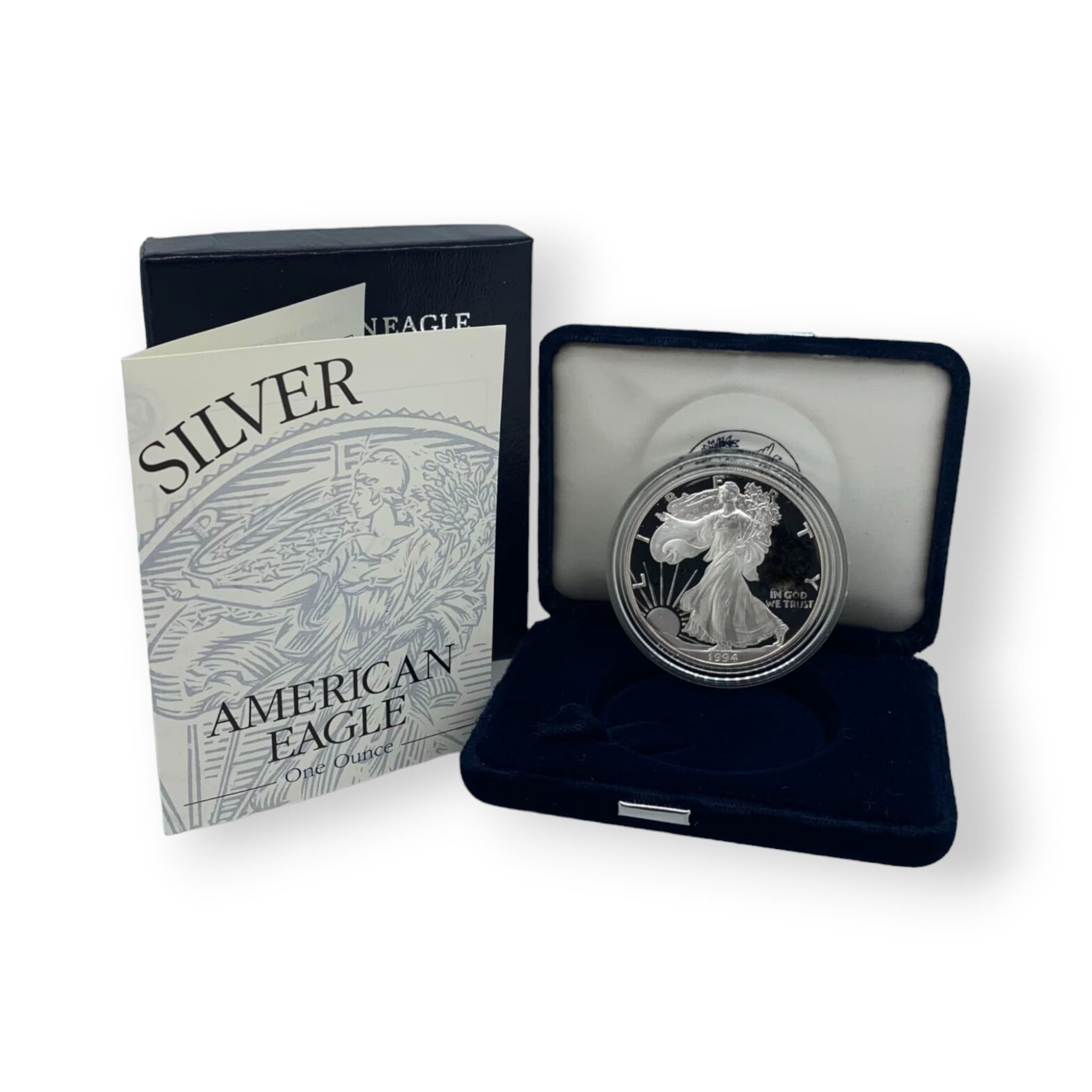 The 1994-P $1 American Proof Silver Eagle, minted from .999 fine silver, comes with its original box and Certificate of Authenticity (COA), featuring the distinctive "P" mint mark indicative of the Philadelphia Mint. This edition is a sought-after collectible within the American Eagle Silver Proof series, admired for its high-quality proof finish that highlights the intricate details of its design. The coin showcases the iconic "Walking Liberty" on the obverse, a design by Adolph A. Weinman, and the heraldic eagle designed by John Mercanti on the reverse. The 1994-P Proof Silver Eagle has a mintage of 372,168, making it a valuable piece for collectors due to its beauty, craftsmanship, and the limited number produced. It represents a significant part of American numismatic history, appealing to collectors and investors alike for its artistic and intrinsic silver value.