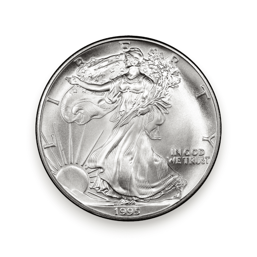 The 1995 1 oz American Silver Eagle Coin is an esteemed part of the American Silver Eagle series, minted by the United States Mint. Comprising one ounce of .999 fine silver, it maintains the series' high standard of silver purity. The coin's obverse features the iconic "Walking Liberty" design by Adolph A. Weinman, a beloved image symbolizing freedom and progress. The reverse, designed by John Mercanti, portrays a heraldic eagle behind a shield, signifying American strength and integrity. The mintage for the 1995 American Silver Eagle was notably about 4,672,051 coins, making it a relatively available year for collectors and investors. This coin is valued for its fine silver content and its historical place within the distinguished American Silver Eagle series.