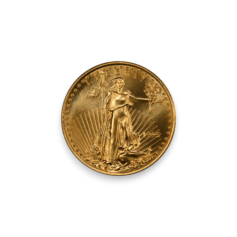The 1995 1/4 oz American Gold Eagle Coin is an esteemed part of the American Gold Eagle series, produced by the United States Mint. Minted from 1/4th of an ounce of gold, this coin features a purity of 22 karats, equivalent to .9167 fineness. It showcases the iconic Saint-Gaudens obverse design, which depicts Lady Liberty holding a torch and olive branch, embodying ideals of freedom and hope. The reverse, designed by Miley Busiek, features a family of eagles, symbolizing American unity and strength. In 1995, the mintage for the 1/4 oz American Gold Eagle was approximately 82,000 coins, making it a popular choice among collectors and investors. This coin is valued for its fine gold content, historical significance, and its place within the American Gold Eagle series, known for its artistic and numismatic merit.