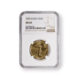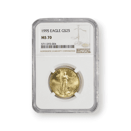 The 1995 $25 American Gold Eagle, certified by the Numismatic Guaranty Corporation (NGC), is a half-ounce gold coin minted from 22-karat gold, corresponding to a .9167 fineness. It showcases the Saint-Gaudens' obverse design of Lady Liberty and the Miley Busiek reverse design of an American eagle family. With a mintage of 53,474, this NGC-certified coin is esteemed for its condition and authenticity, making it a sought-after piece for collectors and a reputable choice for investors seeking to diversify with gold assets. The NGC certification is a mark of confidence for collectors, affirming the coin’s grade and quality.