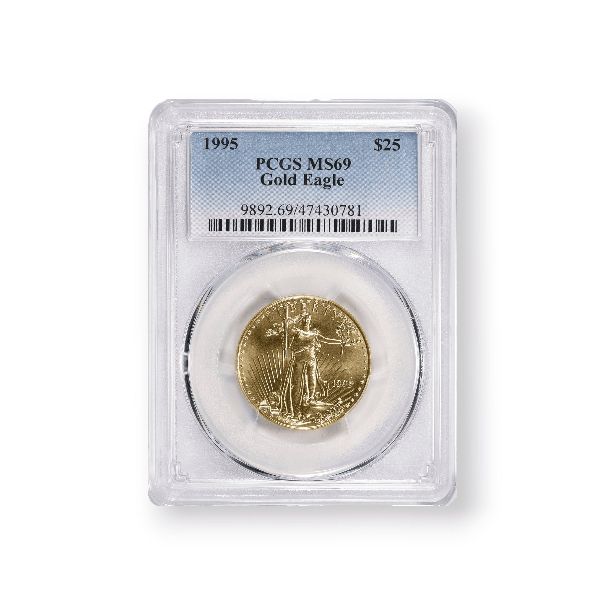 The 1995 $25 American Gold Eagle, certified by the Professional Coin Grading Service (PCGS), is a half-ounce coin minted from 22-karat gold, which translates to a .9167 fineness. It displays the iconic Saint-Gaudens obverse design of Lady Liberty and features Miley Busiek's familial eagle design on the reverse. With a mintage of 53,474, the PCGS certification confirms the coin’s condition and authenticity, enhancing its appeal to collectors and solidifying its status as a desirable investment for its blend of numismatic and precious metal value. The PCGS certification is particularly valued in the numismatic community for its assurance of coin grading integrity.