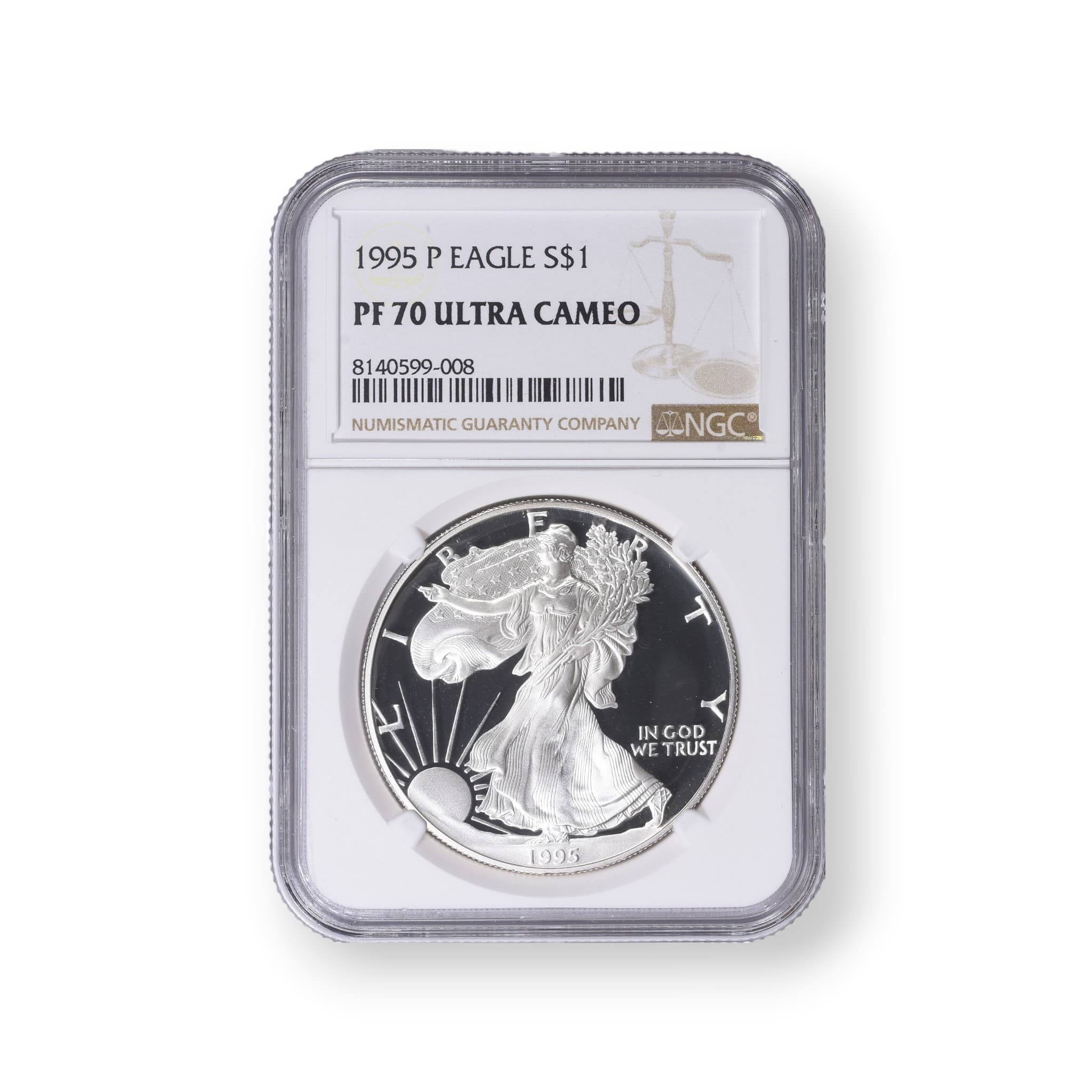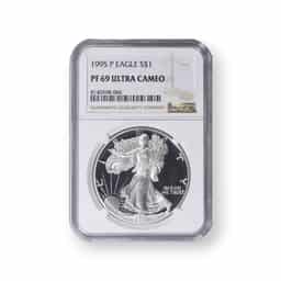 The 1995-P Proof American Silver Eagle $1 Coin is a legal tender coin struck by the United States Mint in Philadelphia. Composed of .999 fine silver, this coin has a weight of 31.101 grams and a diameter of 40.6 millimeters. The obverse features Adolph A. Weinman's iconic Walking Liberty design, while the reverse showcases John Mercanti's heraldic eagle design. This particular coin is a proof strike, meaning it was struck using highly polished dies and specially treated planchets to achieve a mirror-like finish and frosted devices. The mintage for the 1995-P Proof American Silver Eagle is 516,049 coins, and it bears the "P" mint mark, indicating its Philadelphia origin. This coin has been certified by the Numismatic Guaranty Corporation (NGC), ensuring its authenticity and condition.