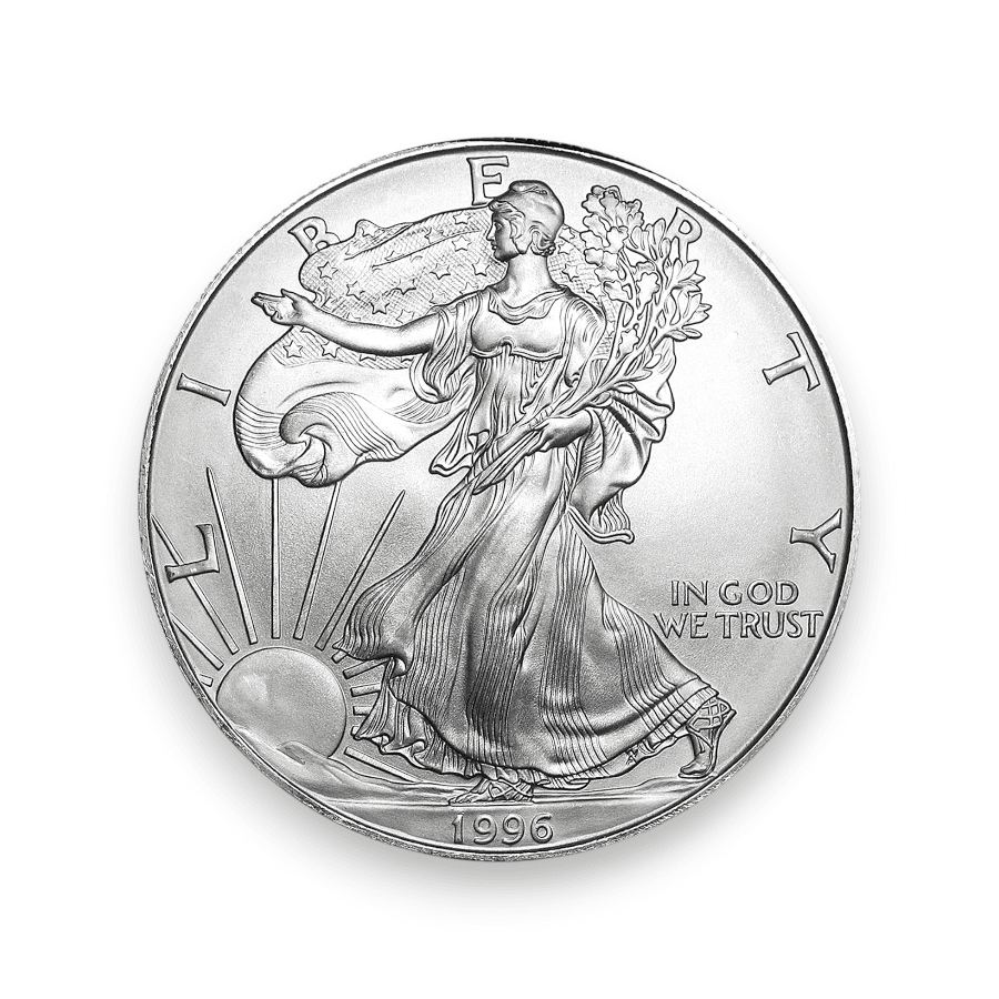 The 1996 1 oz American Silver Eagle Coin holds a special place in the American Silver Eagle series from the United States Mint due to its remarkably low mintage. Comprised of one ounce of .999 fine silver, this coin upholds the series' standard for high silver purity. It features the iconic "Walking Liberty" design by Adolph A. Weinman on the obverse, epitomizing freedom and grace. The reverse, designed by John Mercanti, depicts a heraldic eagle behind a shield, symbolizing American strength and resolve. The 1996 edition is particularly significant for collectors and investors, with a mintage of only approximately 3,603,386 coins, making it the lowest mintage in the series to date and a highly sought-after year for its rarity and value as a collectible.
