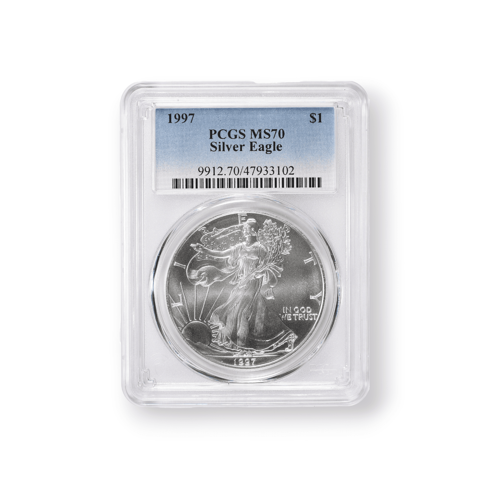 The 1997 $1 American Silver Eagle, certified by the Professional Coin Grading Service (PCGS), is a distinguished collectible struck in one ounce of .999 fine silver. This coin is renowned for its Walking Liberty design on the obverse, a depiction of hope and freedom by Adolph A. Weinman that has graced the coin since its inception. The reverse side features the stately heraldic eagle design by John Mercanti, a representation of American strength and integrity. With a mintage of 4,295,004, the PCGS certification confirms the coin's authenticity and mint state condition, making it a valuable addition to any collection and a secure investment due to its precious metal content and numismatic worth.