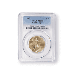 The 1997 $25 American Gold Eagle, certified by the Professional Coin Grading Service (PCGS), is a half-ounce gold coin minted from 22-karat gold, denoting a .9167 fineness. It carries the illustrious Saint-Gaudens design of Lady Liberty on the obverse, while the reverse features Miley Busiek’s depiction of a family of eagles. With a mintage of 26,344, the coin's PCGS certification verifies its condition and authenticity, making it a sought-after collectible and a sound investment. The PCGS certification is highly regarded for its strict grading standards, which adds to the coin's credibility and desirability among collectors and investors.