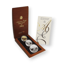 The 1997 Impressions of Liberty Set is an exquisite collection from the United States Mint featuring three proof-quality coins: the Platinum American Eagle, the Silver American Eagle, and the Gold American Eagle. Each coin in the set showcases iconic symbols of American freedom and democracy, such as the Statue of Liberty on the Platinum Eagle and the heraldic eagle on the Silver and Gold Eagles. The Proof condition of these coins signifies that they have been struck using specially prepared dies and polished planchets to produce a sharp, mirror-like finish, which distinguishes them from their business-strike counterparts. Presented in an elegant display box with a Certificate of Authenticity (COA), this set is highly sought after by collectors for its beauty, limited mintage, and the significance of the coins it contains.