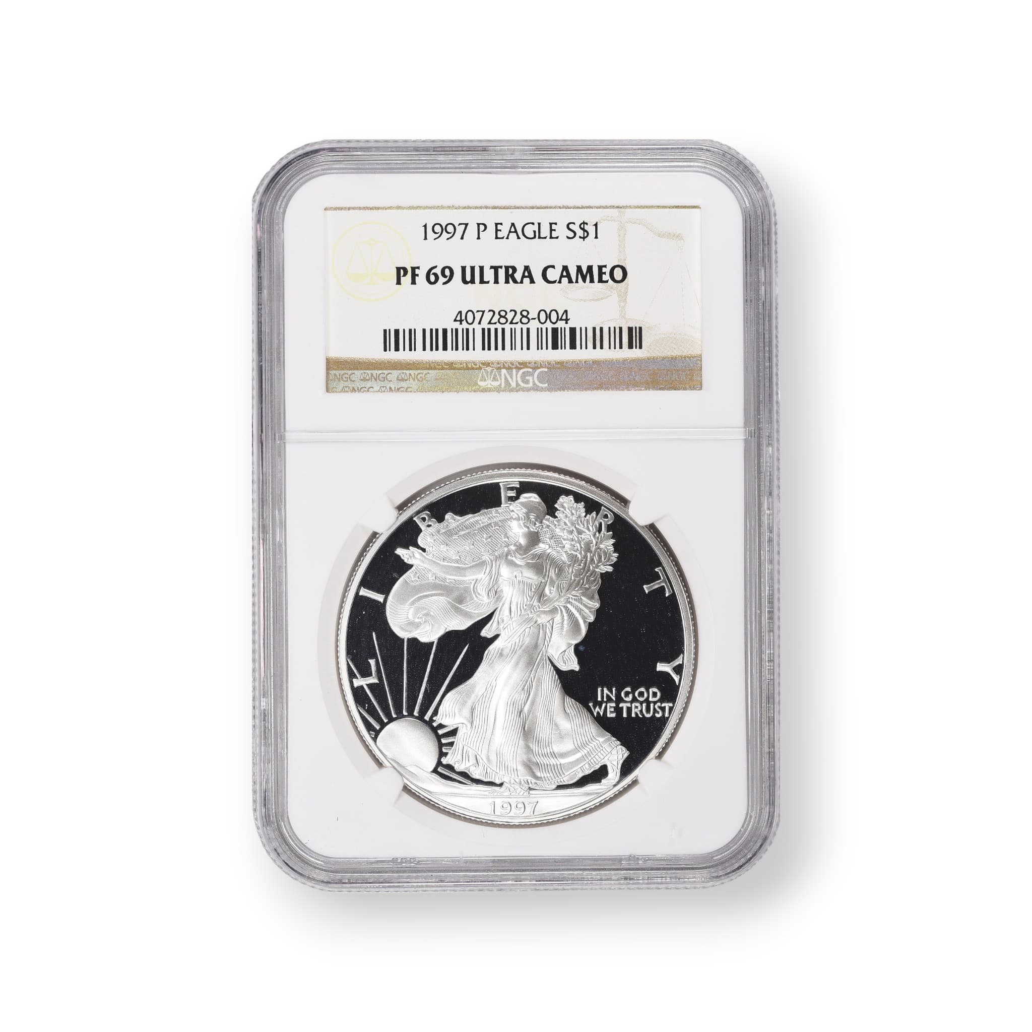 The 1997-P Proof American Silver Eagle $1 Coin is a legal tender coin struck by the United States Mint in Philadelphia. Composed of .999 fine silver, this coin has a weight of 31.101 grams and a diameter of 40.6 millimeters. The obverse features Adolph A. Weinman's iconic Walking Liberty design, while the reverse showcases John Mercanti's heraldic eagle design. This particular coin is a proof strike, meaning it was struck using highly polished dies and specially treated planchets to achieve a mirror-like finish and frosted devices. The mintage for the 1997-P Proof American Silver Eagle is 1,048,144 coins, and it bears the "P" mint mark, indicating its Philadelphia origin. This coin has been certified by the Numismatic Guaranty Corporation (NGC), ensuring its authenticity and condition.