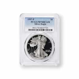 The 1997-P Proof American Silver Eagle $1 Coin is a legal tender coin struck by the United States Mint in Philadelphia. Composed of .999 fine silver, this coin features the iconic Walking Liberty design by Adolph A. Weinman on the obverse and the heraldic eagle with shield design by John Mercanti on the reverse. The coin has a weight of 31.101 grams and a diameter of 40.6 millimeters. The mintage for the 1997-P Proof American Silver Eagle is 1,048,144 coins, and each coin bears the "P" mint mark, indicating its production at the Philadelphia Mint. This particular coin has been certified by the Professional Coin Grading Service (PCGS), ensuring its authenticity and condition.