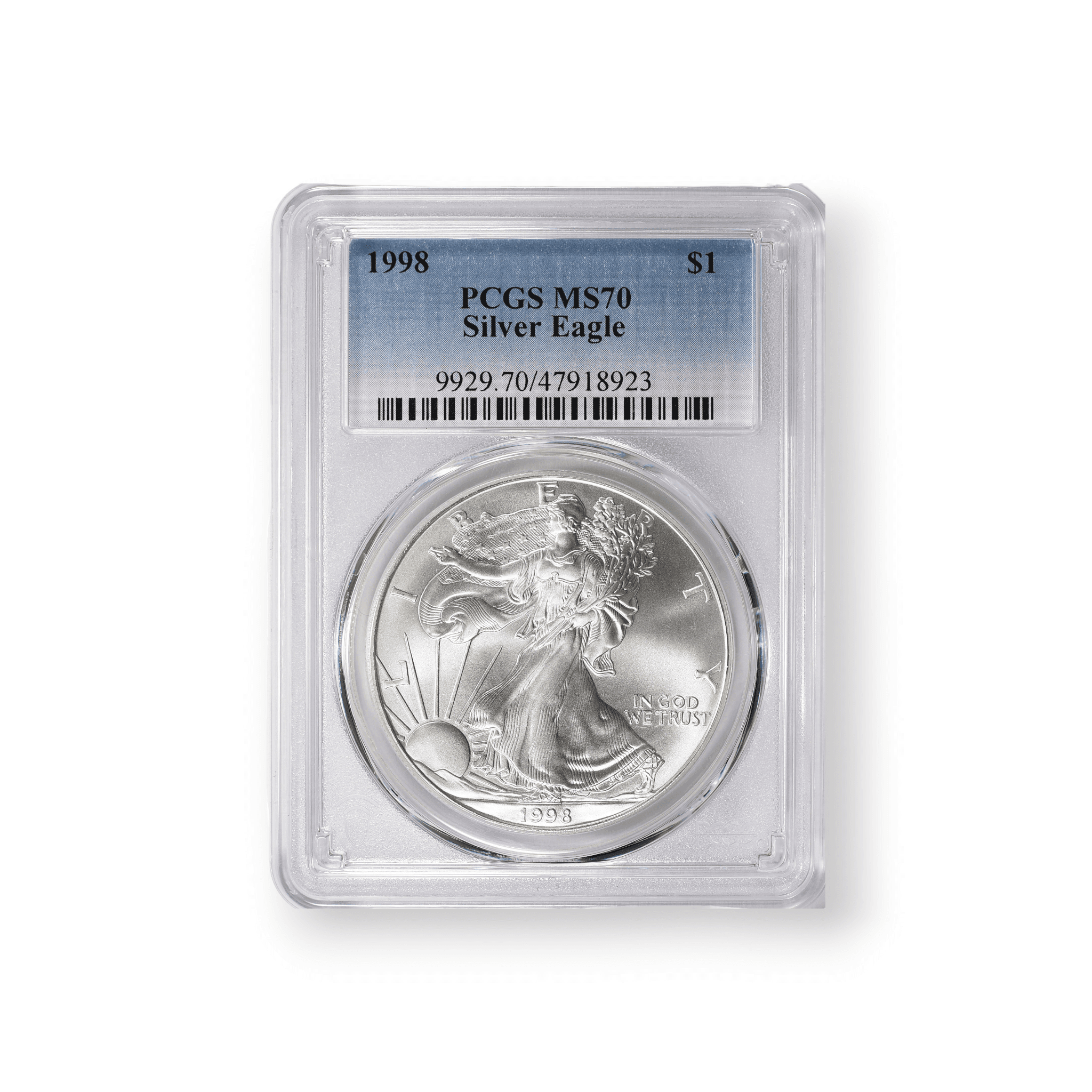The 1998 $1 American Silver Eagle, certified by the Professional Coin Grading Service (PCGS), is a treasured collectible coin struck by the U.S. Mint. This coin is comprised of one ounce of .999 fine silver and showcases the acclaimed Walking Liberty design by Adolph A. Weinman on the obverse, a symbol of the nation's liberty and pioneering spirit. The reverse features the majestic heraldic eagle design by John Mercanti, embodying America's strength and resilience. The mintage for this year's coin stands at 4,847,549. The PCGS certification guarantees the coin's authenticity and condition, making it a secure and valuable addition to any collection, highly regarded for both its numismatic significance and its inherent precious metal value.