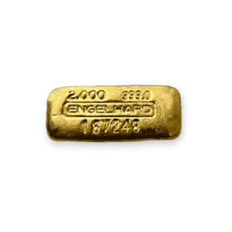 The 2 oz Engelhard Poured Gold Loaf Bar, with a .999 fine purity, is a highly prized item for collectors and investors in the precious metals market. Engelhard, known for its legacy and quality in bullion production, crafts this bar using a traditional pouring method, resulting in a unique, loaf-like appearance that distinguishes it from minted bars. Each bar contains two ounces of 99.9% pure gold, showcasing Engelhard's commitment to high purity standards. The individual character of these poured bars, with their rustic finish and texture, adds to their appeal, making each piece distinct. The reputation of Engelhard as a trusted and respected name in the industry further enhances the desirability of these gold loaf bars, sought after not only for their gold content but also for their craftsmanship and the historical prestige of the Engelhard brand.