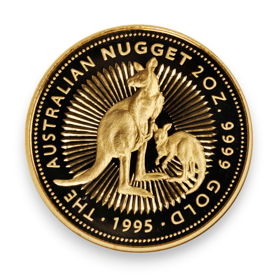 The 2 oz Gold Australian Kangaroo coin, minted by the Perth Mint, is a highly sought-after bullion coin amongst investors and collectors. Featuring one of Australia's most iconic animals, the kangaroo, the coin's design varies each year, which adds a collectible appeal on top of its investment value. Struck with two ounces of .9999 fine gold, these coins are legal tender in Australia and are known for their purity and craftsmanship. While the "Random Date" specification indicates that the year of the coin may vary when purchased, each release captures the essence of the Australian outback and the kangaroo's distinctive imagery.