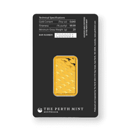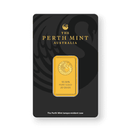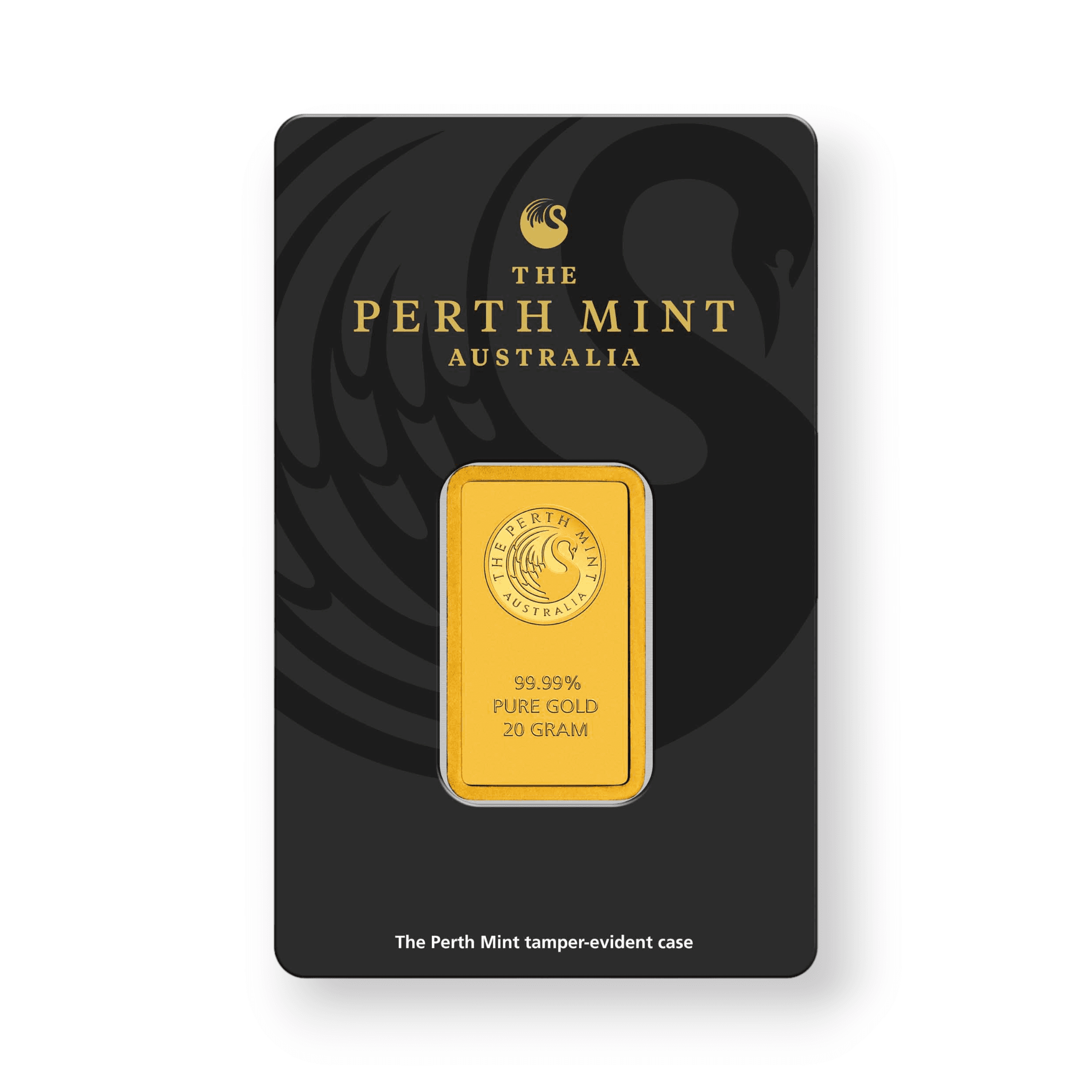 The 20 Gram Perth Mint Gold Bar, featuring a .9999 fine purity and sealed in an assay card, is a substantial and premium product from the prestigious Perth Mint in Australia. Containing 20 grams of gold with an exceptionally high purity of 99.99%, this bar exemplifies the Perth Mint's commitment to high standards in precious metal refining. The design of the bar often showcases the mint's iconic swan logo or other distinctive Australian elements, adding to its collectible and aesthetic appeal. Encased in a tamper-evident assay card, the bar is both protected and authenticated, with the card providing important details such as the bar's weight, purity, and a unique serial number for verification. This 20 Gram Perth Mint Gold Bar is highly prized in the precious metals market for its significant weight, exceptional purity, and renowned reputation of the Perth Mint, making it an attractive choice for investors and collectors seeking high-quality gold products.