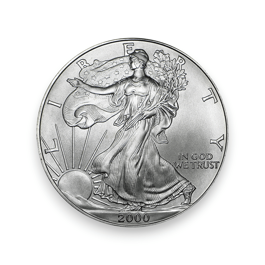 The 2000 1 oz American Silver Eagle Coin is a significant year in the renowned American Silver Eagle series, minted by the United States Mint. Composed of one ounce of .999 fine silver, this coin upholds the series' high standard of purity. On the obverse, it features the iconic "Walking Liberty" design by Adolph A. Weinman, an image that symbolizes freedom and is widely admired in American coinage. The reverse, designed by John Mercanti, portrays a heraldic eagle with a shield, representing the strength and dignity of the United States. The mintage for the 2000 American Silver Eagle was approximately 9,239,132 coins. This substantial production makes the 2000 edition a well-circulated and accessible choice for collectors and investors, who appreciate it for its fine silver content and its historical significance in the American Silver Eagle series.