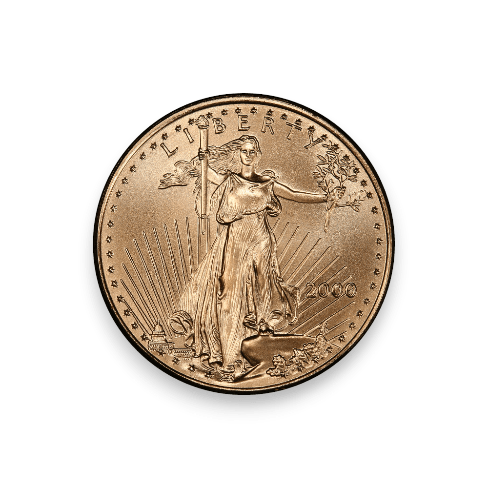 The 2000 1/2 oz American Gold Eagle Coin, part of the prestigious American Gold Eagle series, is produced by the United States Mint. This coin contains 1/2 an ounce of gold with a purity of 22 karats, equivalent to .9167 fineness. It showcases the renowned Saint-Gaudens design on the obverse, featuring Lady Liberty with a torch and olive branch, symbolizing freedom and enlightenment. The reverse, designed by Miley Busiek, depicts a family of eagles, representing the unity and strength of America. In 2000, the mintage for the 1/2 oz American Gold Eagle was approximately 32,028 coins. This production level makes the 2000 Gold Eagle a popular choice among collectors and investors, appreciated for its fine gold content, historical significance, and artistic beauty within the American Gold Eagle series.