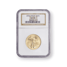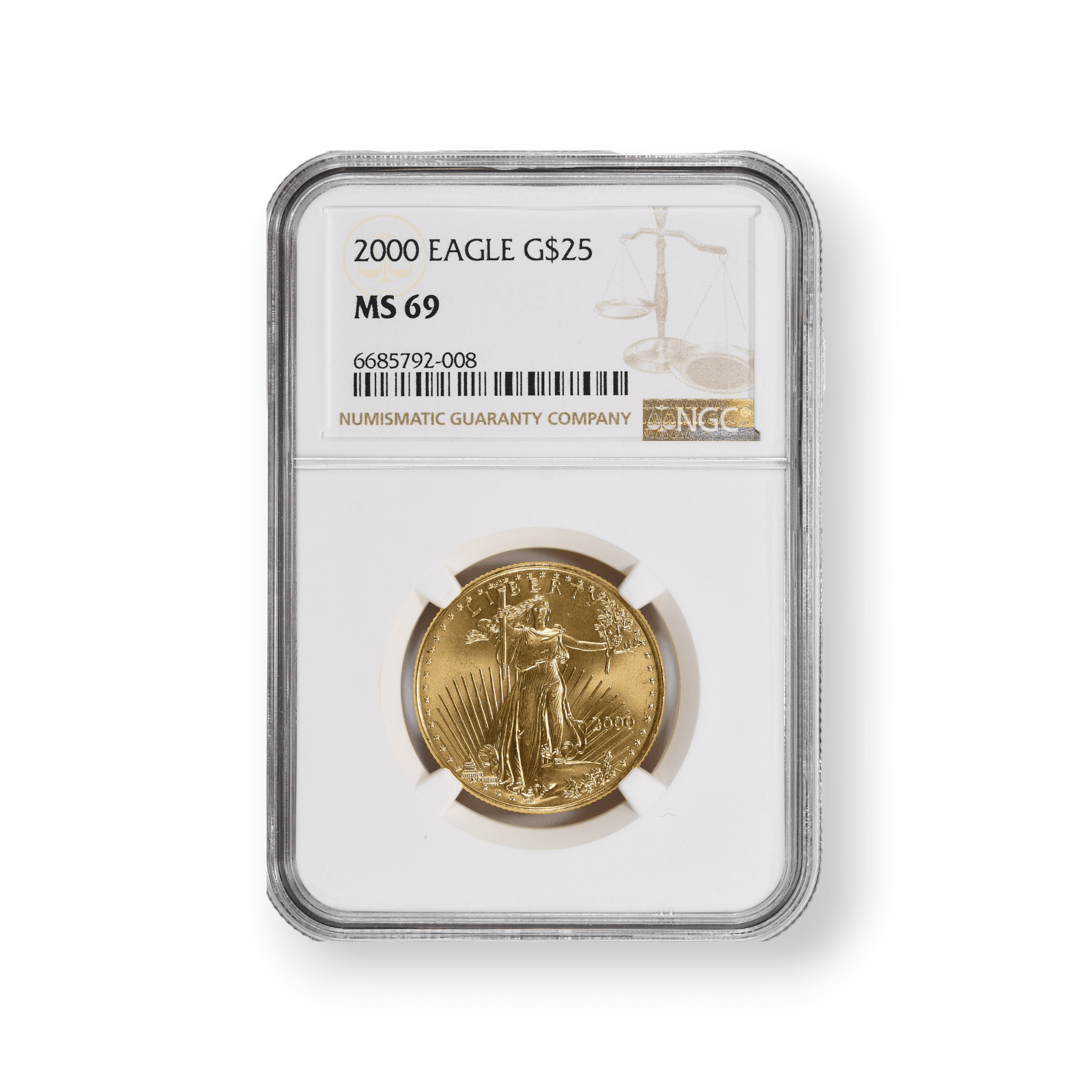 The 2000 $25 American Gold Eagle, certified by the Numismatic Guaranty Corporation (NGC), is a half-ounce gold coin minted from 22-karat gold, which corresponds to a fineness of .9167. It features the esteemed Saint-Gaudens design on the obverse, showcasing Lady Liberty, and Miley Busiek's depiction of a family of eagles on the reverse. With a mintage of 32,028, the NGC certification confirms the coin’s condition and authenticity, enhancing its collectibility and attractiveness to investors. NGC's reputation for precision in coin grading makes this piece a trusted and valuable addition to any collection or investment in precious metals.