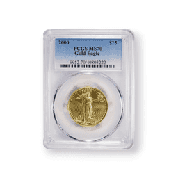 The 2000 $25 American Gold Eagle, certified by the Professional Coin Grading Service (PCGS), is a half-ounce gold coin minted from 22-karat gold, indicating a .9167 fineness. The coin displays the iconic Saint-Gaudens design of Lady Liberty on the obverse, and the reverse portrays Miley Busiek's family of eagles. With a mintage of 32,028, the PCGS certification ensures the coin's condition and authenticity, making it a valuable item for collectors and a reputable asset for investors due to its gold content and historical significance. The PCGS is known for its stringent grading standards, adding significant trust and value to this investment-grade coin.