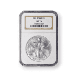The 2001 $1 American Silver Eagle, certified by the Numismatic Guaranty Corporation (NGC), is a prized coin for collectors and silver investors. It is struck from one ounce of .999 fine silver, and it showcases the renowned Walking Liberty design by Adolph A. Weinman on the obverse, which has become an emblem of American freedom and optimism. On the reverse, the coin features John Mercanti's heraldic eagle, representing the United States' strength and integrity. This particular coin, with a mintage of 9,001,711, is authenticated and graded by the NGC, a testament to its quality and ensuring its appeal to those who appreciate the confluence of numismatic artistry and the intrinsic value of silver.