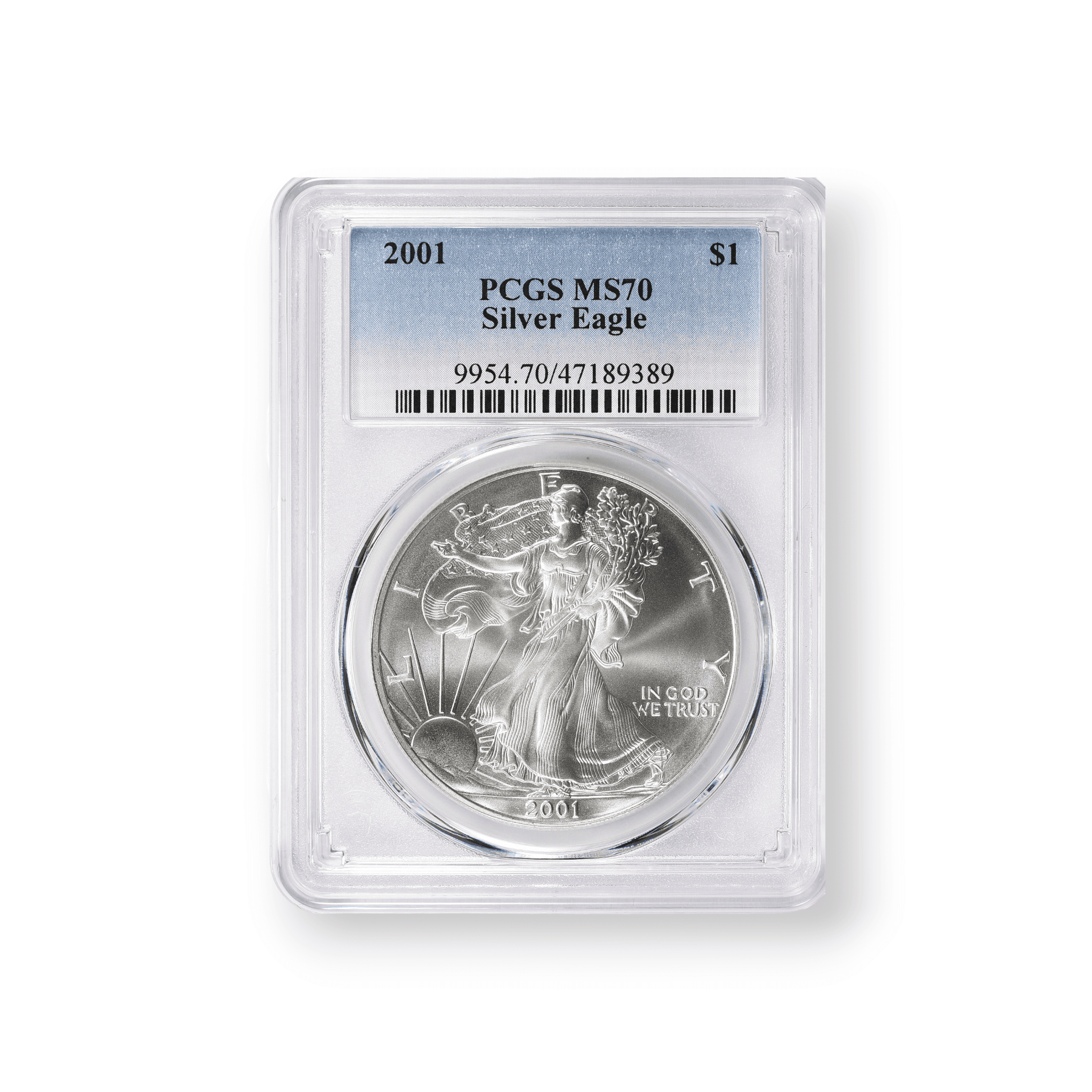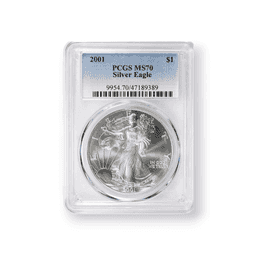 The 2001 $1 American Silver Eagle, certified by the Professional Coin Grading Service (PCGS), is a notable collectible from the United States Mint. Minted from one ounce of .999 fine silver, it features the storied Walking Liberty design by Adolph A. Weinman on the obverse, an allegory of freedom's forward march. The reverse hosts John Mercanti's heraldic eagle, a symbol of the nation's might and unity. With a mintage of 9,001,711, the PCGS certification ensures the coin's condition and genuineness, making it a valuable piece for collectors and a trusted investment for those interested in precious metals.