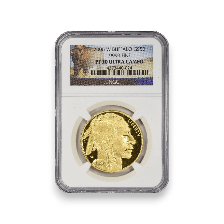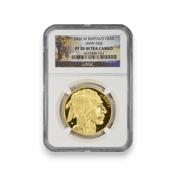 The 2006-W Proof Buffalo Gold Coin is a remarkable numismatic piece, minted in .9999 fine gold. This coin features the iconic Buffalo Nickel design by James Earle Fraser, which includes a depiction of an American Bison on one side and a Native American profile on the other. Struck at the West Point Mint, indicated by the 'W' mintmark, it represents the U.S. Mint's first foray into 24-karat gold coinage. This proof coin is known for its exceptional detail and mirror-like finish, achieved through a specialized minting process. Certified by the Numismatic Guaranty Corporation (NGC), the coin's condition and authenticity are assured. With an exact mintage of 246,267, this coin is not only a testament to American heritage but also a sought-after item for collectors and investors due to its rarity and historical significance.
