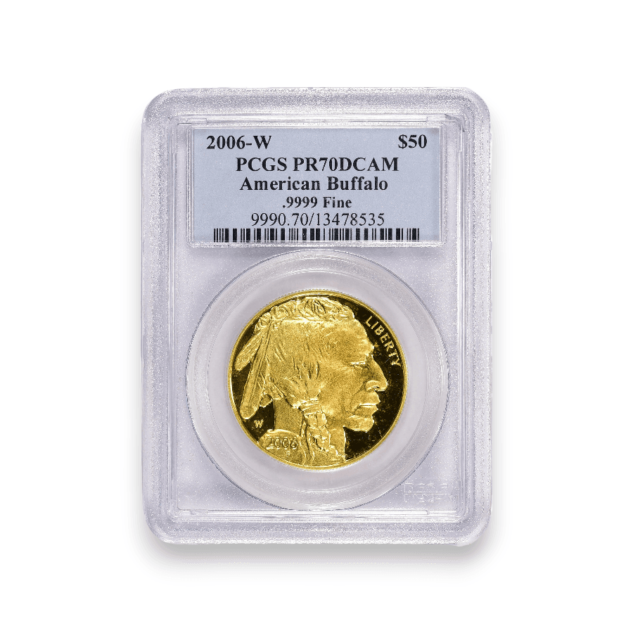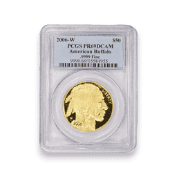 The 2006-W Proof Buffalo 1 oz $50 Gold Coin, certified by PCGS, is a distinguished collector's item, crafted in .9999 fine gold. This coin features the classic Buffalo Nickel design by James Earle Fraser, showcasing an American Bison on one side and a Native American profile on the other. Produced at the West Point Mint, as indicated by the 'W' mintmark, this coin is a part of the United States Mint's inaugural series of 24-karat gold coins. The proof quality of the coin, characterized by its sharp detail and mirror-like finish, is a testament to the Mint's craftsmanship. PCGS certification assures collectors of its authenticity and condition. Notably, the exact mintage of the 2006-W Proof Buffalo Gold Coin is 246,267, making it a rare and valuable piece for both numismatic enthusiasts and investors. Its limited production, combined with its historical and artistic significance, enhances its appeal in the collector's market.