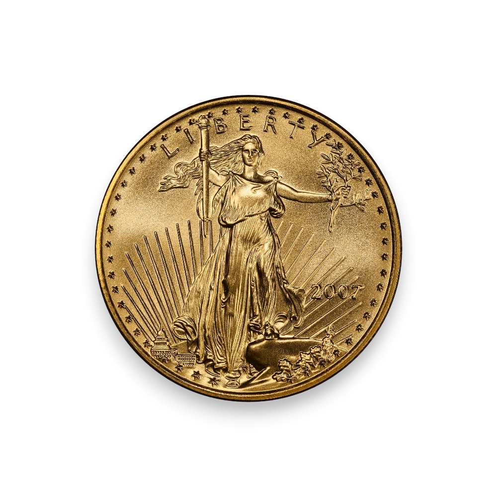 The 2007 1/2 oz American Gold Eagle Coin, a prominent issue in the American Gold Eagle series, is produced by the United States Mint. This coin is composed of 1/2 an ounce of gold and boasts a purity of 22 karats, equivalent to .9167 fineness. It features the renowned Saint-Gaudens design on the obverse, depicting Lady Liberty with a torch and olive branch, symbols of freedom and peace. The reverse, designed by Miley Busiek, showcases a family of eagles, an image that embodies American unity and strength. In 2007, the mintage for the 1/2 oz American Gold Eagle was approximately 47,002 coins. This production number makes the 2007 Gold Eagle a sought-after piece for collectors and investors, appreciated for its fine gold content, historical significance, and artistic beauty within the esteemed American Gold Eagle series.