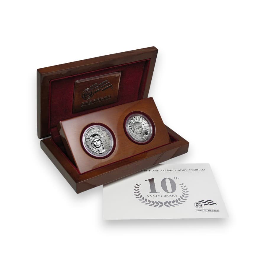 The 2007-W 10th Anniversary 2-Coin American Platinum Eagle 1/2 oz Proof/Reverse Proof Set is a special commemorative set issued by the United States Mint to celebrate the 10th anniversary of the American Platinum Eagle coin series. This set features two 1/2 oz platinum coins – one with a traditional proof finish and the other with a reverse proof finish, where the design elements are frosted and the fields are mirrored. The coins are struck in .9995 fine platinum and feature the iconic "Statue of Liberty" obverse design and the soaring eagle reverse design. The set comes encapsulated in a protective lens, housed in a prestigious wooden box, and accompanied by a Certificate of Authenticity (COA). The final mintage for this highly sought-after set was 20,109 units.