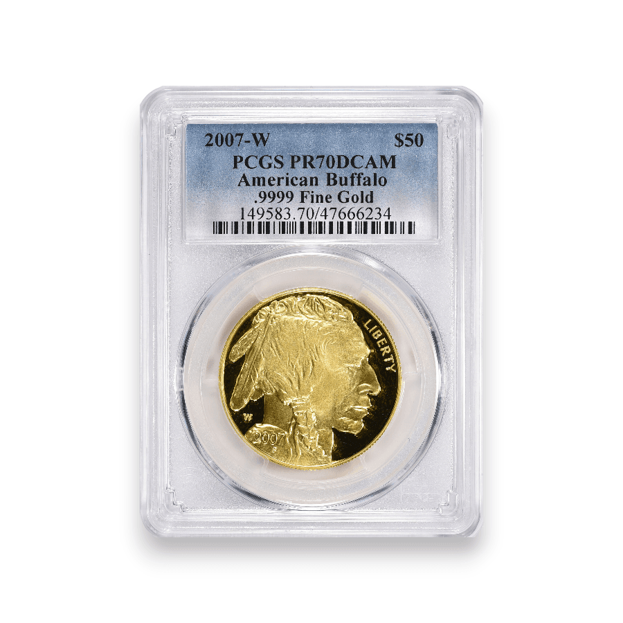 The 2007-W Proof Buffalo 1 oz $50 Gold Coin, PCGS Certified, stands as a distinguished piece in the world of numismatics, minted with a purity of .9999 fine gold. This coin bears the classic Buffalo Nickel design by James Earle Fraser, featuring a striking American Bison on one side and a Native American profile on the other. Produced at the West Point Mint, indicated by the 'W' mintmark, this coin is a part of the U.S. Mint's series of 24-karat gold coins. The proof designation of this coin signifies its high-quality finish with sharp details and a mirror-like background, highlighting the intricacy of Fraser's design. Certified by the Professional Coin Grading Service (PCGS), the coin's authenticity and condition are reliably assured. With an exact mintage of 58,998, the 2007-W Proof Buffalo Gold Coin is a rare and coveted item, highly prized by collectors and investors for its artistic merit, historical significance, and gold content. This limited mintage adds to its desirability and value in the numismatic market.